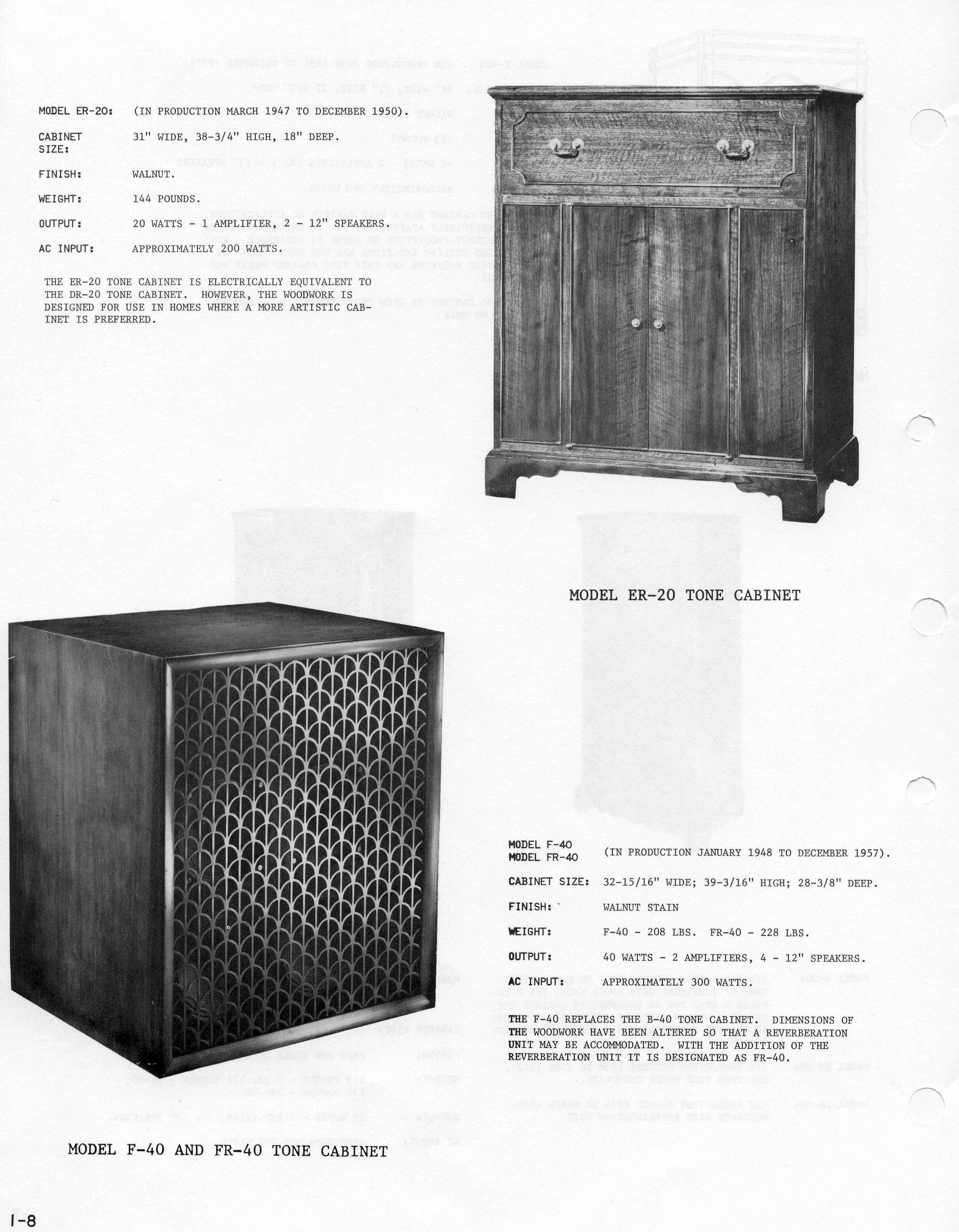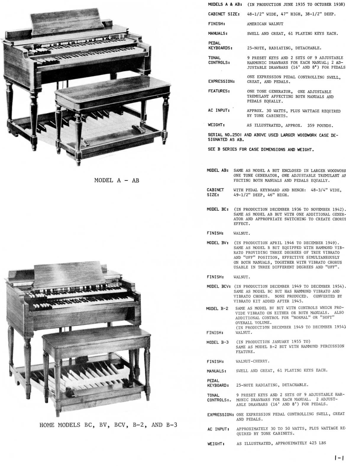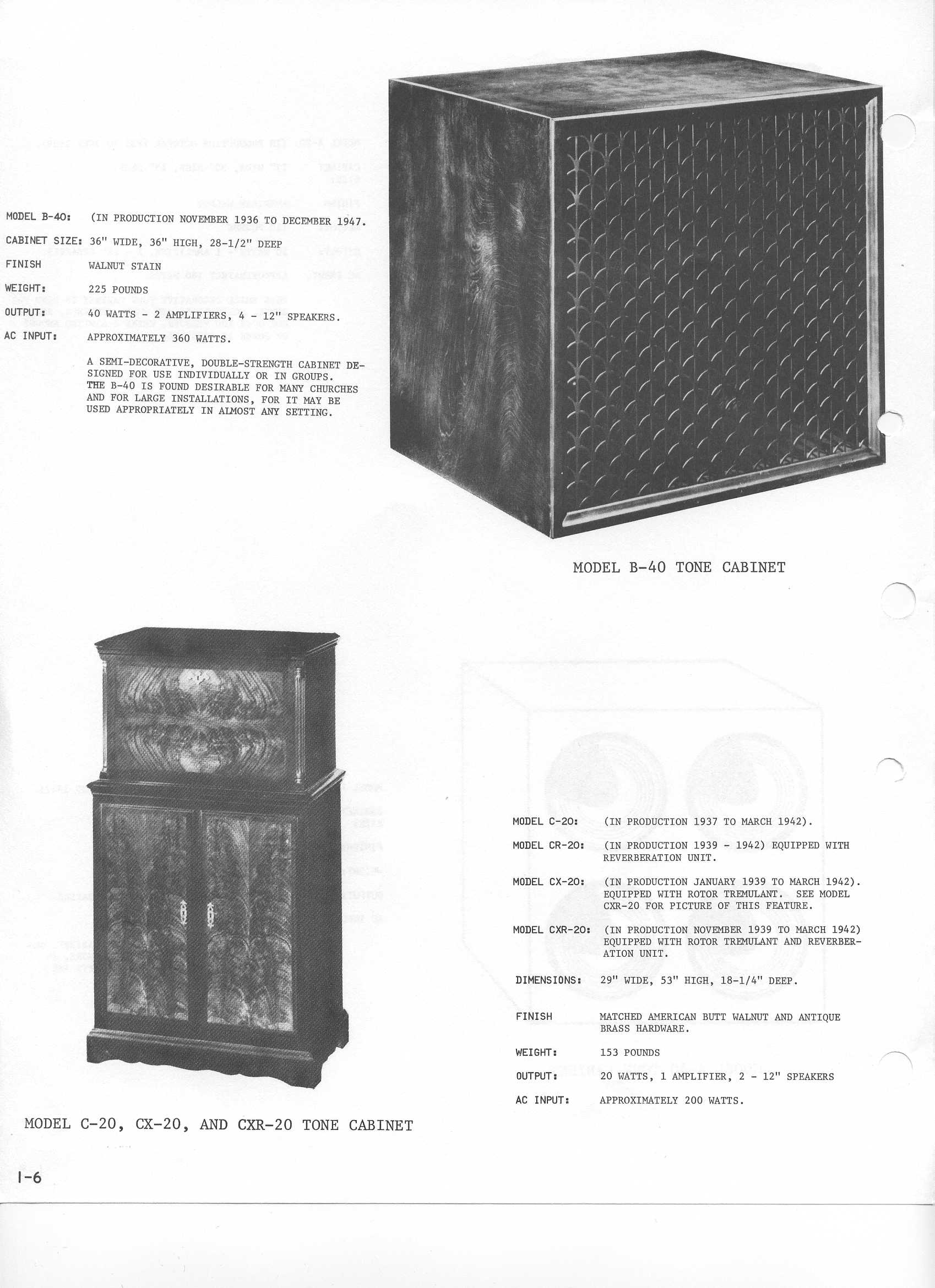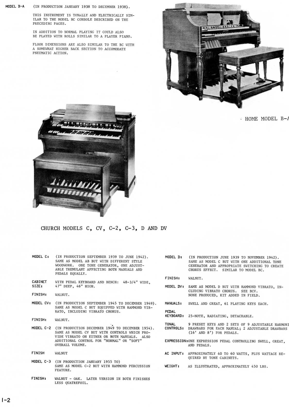 Models - BC, BV, BCV, B-2 & B3 1-1 Model BA (Roll Player Organ) Models C, CV, C-2, C-3, D & DV 1-2 Models G, C-2, 2G, C-3G Consoles & G-40, HR-40G Tone Cabinets Model E (Concert Model) 1-3 Models RT, RT-2 & RT-3 1-4 Models A-100, D-100 1-4A, 1-4B TONE CABINETS (thumbnails 2) Model A-20,