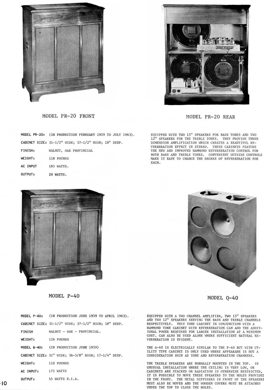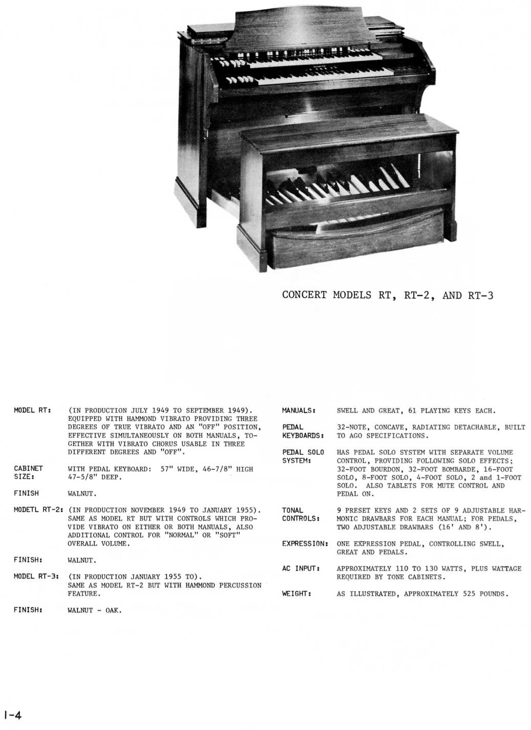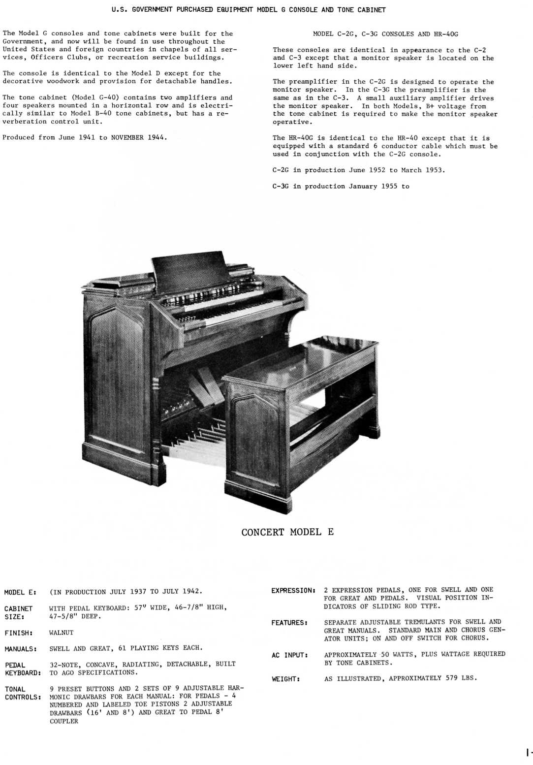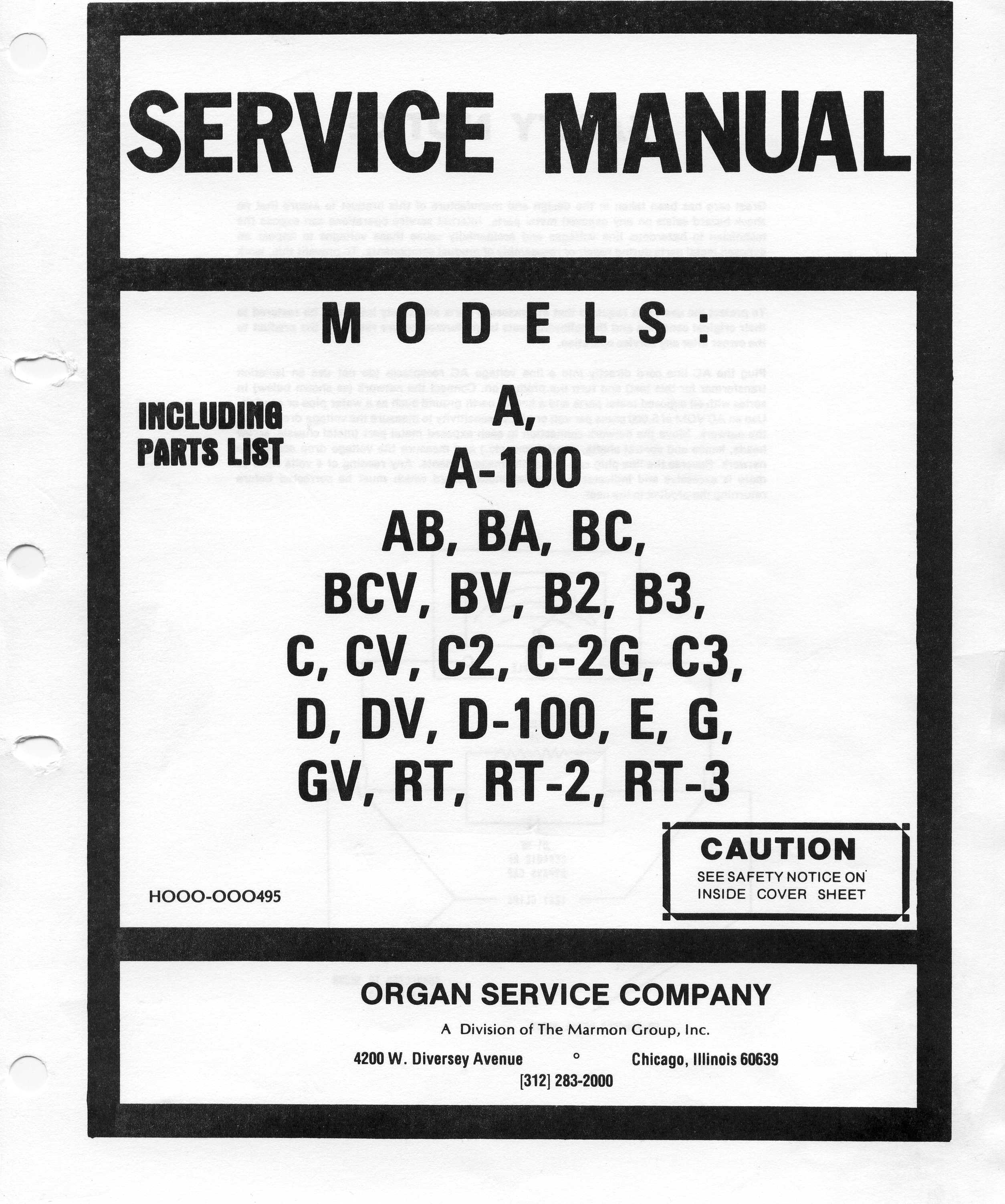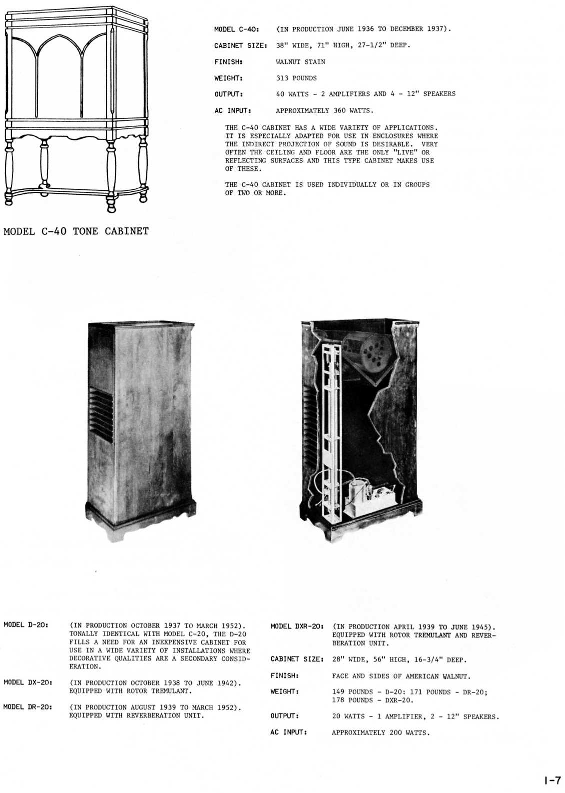 Models - BC, BV, BCV, B-2 & B3 1-1 Model BA (Roll Player Organ) Models C, CV, C-2, C-3, D & DV 1-2 Models G, C-2, 2G, C-3G Consoles & G-40, HR-40G Tone Cabinets Model E (Concert Model) 1-3 Models RT, RT-2 & RT-3 1-4 Models A-100, D-100 1-4A, 1-4B TONE CABINETS (thumbnails 2) Model A-20,
