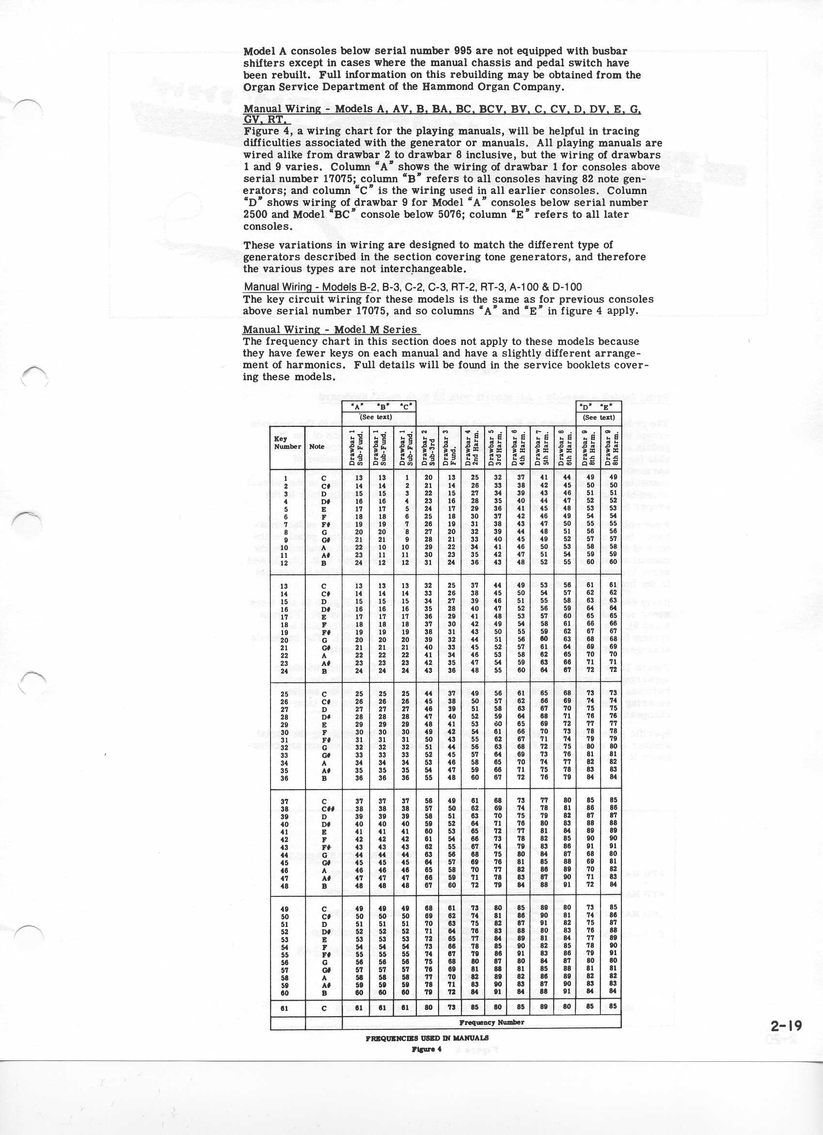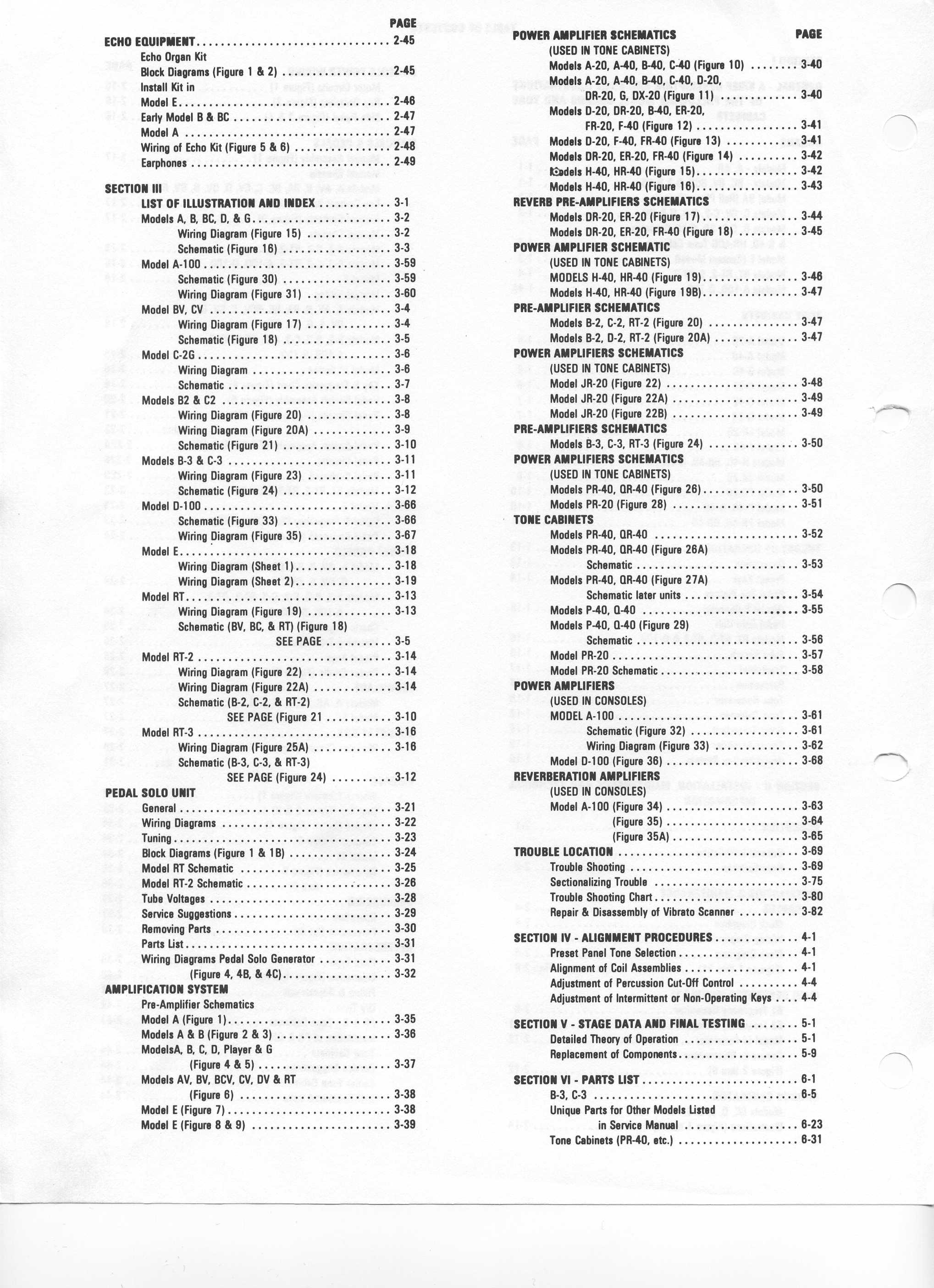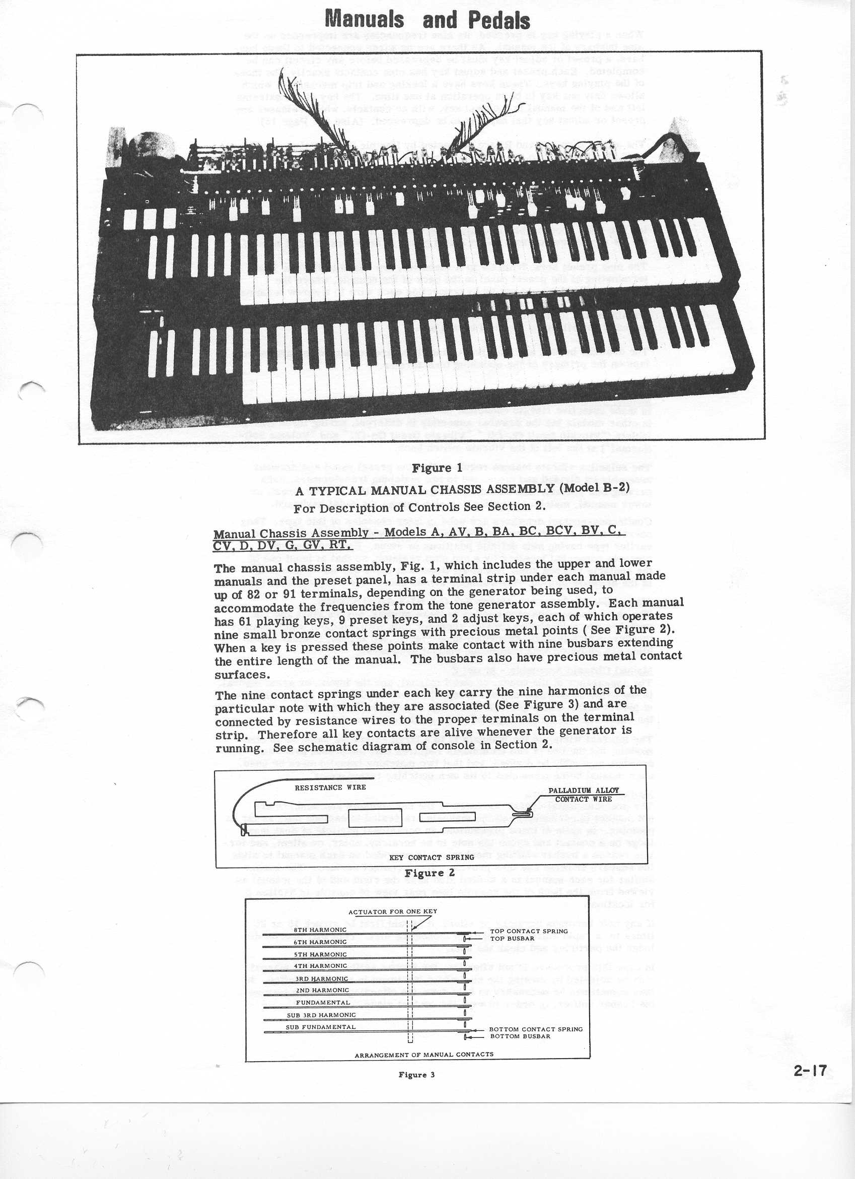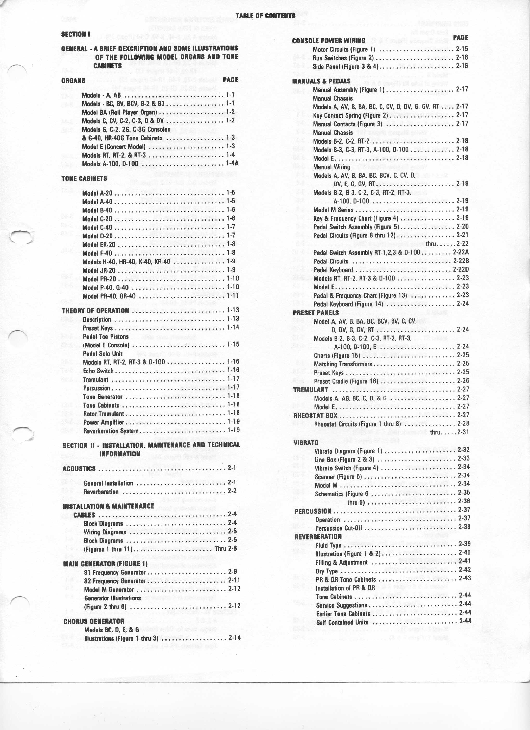 Manual Chassis Models A, AV, B, BA, BC, C, CV, D, DV, G, GV, RT 2-17 Key Contact Spring (Figure 2) 2-17 Manual Contacts (Figure 3) 2-17 Manual Chassis Models B-2, C-2, RT-2 Models B-3, C-3, RT-3, A-100, D-100 Model E 2-18 (manquante) Manual Wiring Models A, AV, B, BA, BC, BCV, C, CV, D, DV, E, G, GV, RT 2-19 Models B-2, B-3, C-2, C-3, RT-2, RT-3, A-100, D-100 2-19 Model M Series 2-19 Key & Frequecy Chart (Figure 4) 2-19 Pedal Switch Assembly (Figure 5) 2-20 Pedal Circuits (Figure 8 thru 12) 2-21, 2-22 Pedal Switch Assembly RT-1, 2, 3 & D-100 2-22A Pedal Circuits 2-22B, 2-22C Pedal Keyboard 2-22D Models RT, RT-2, RT-3 & D-100 2-23 Model E Pedal & Frequency Chart (Figure 13) 2-23 Pedal Keyboard (Figure 14) 2-24 PRESET PANELS Model A, AV, B, BA, BC, BCV, BV,