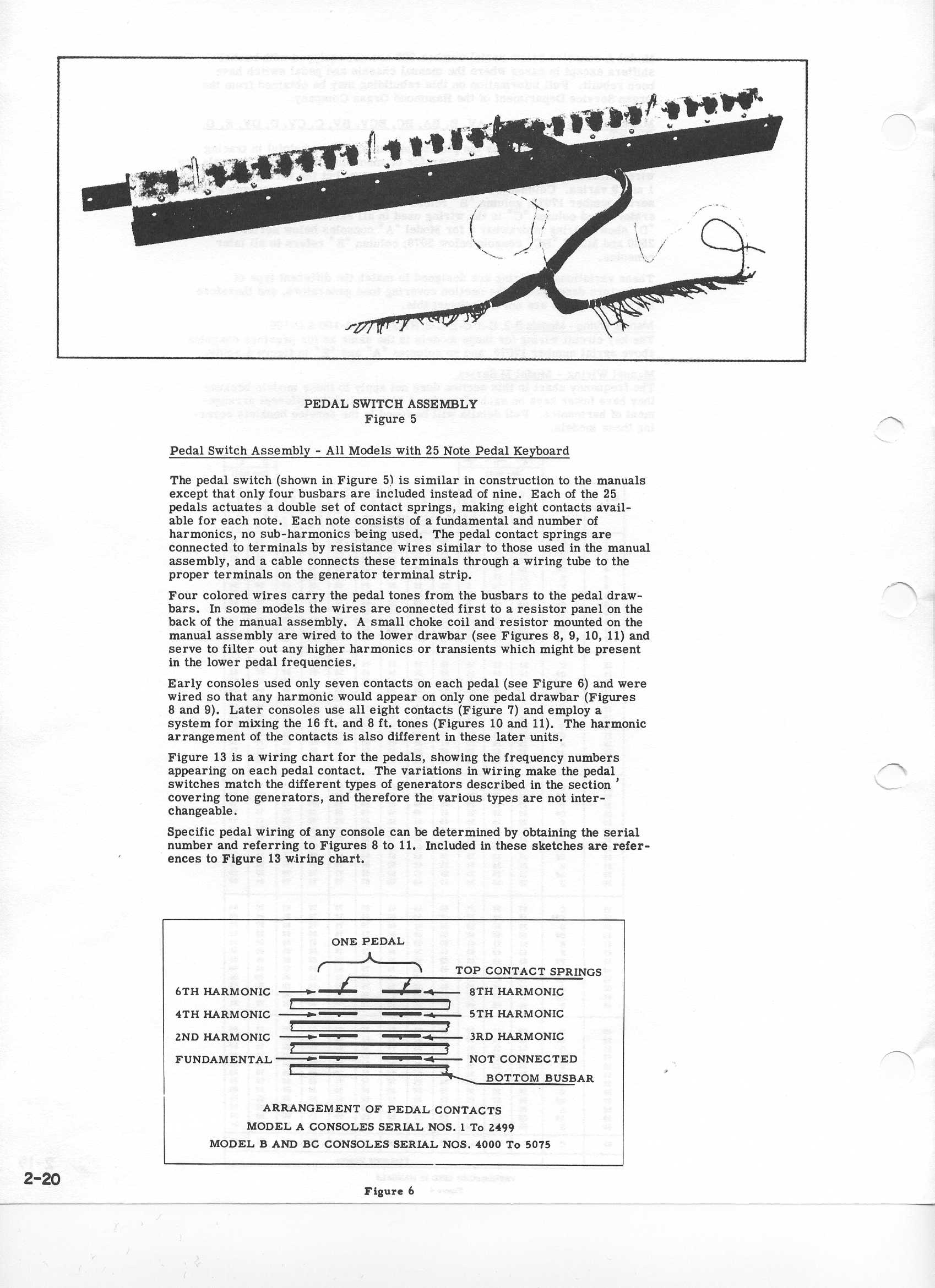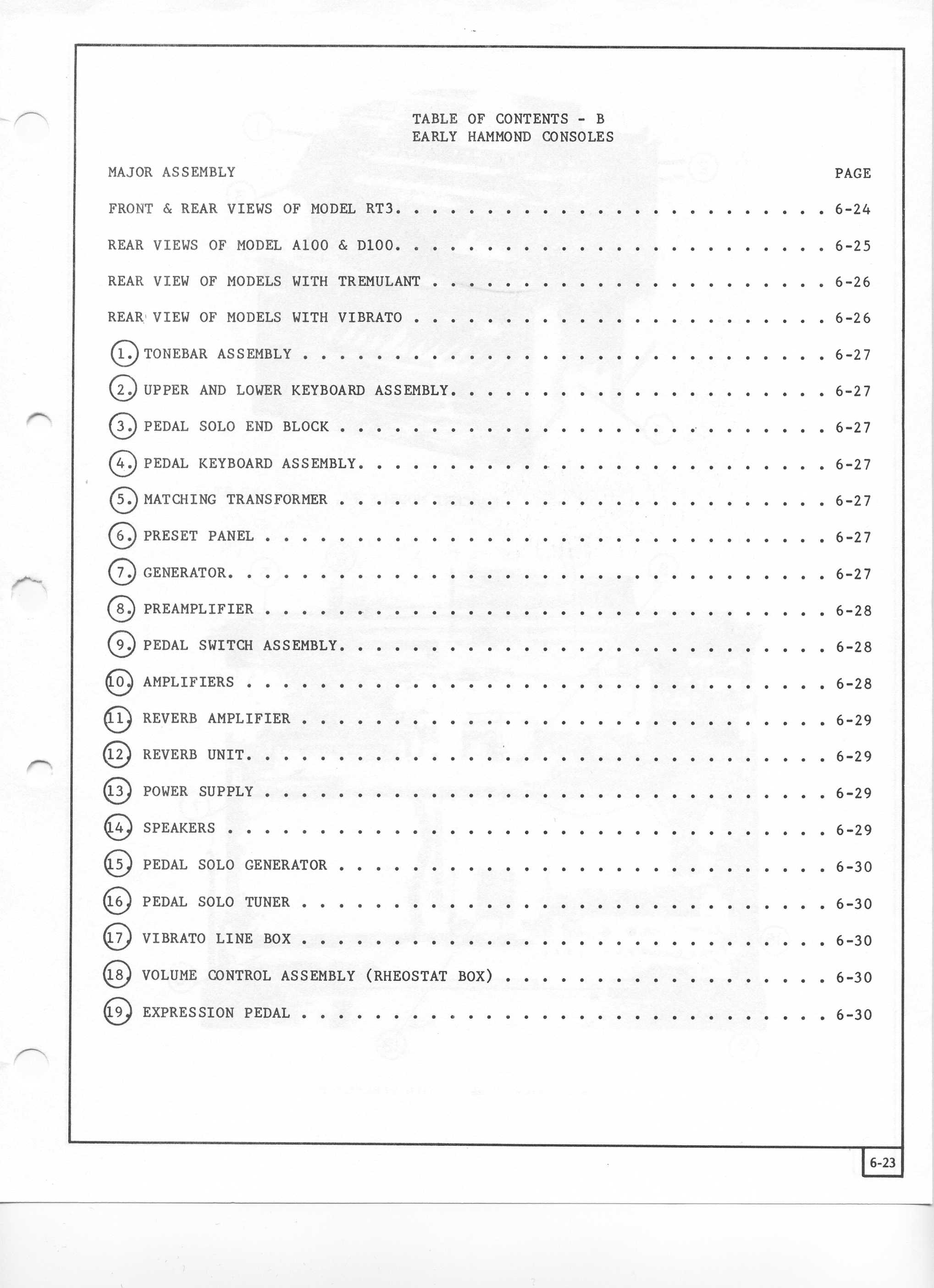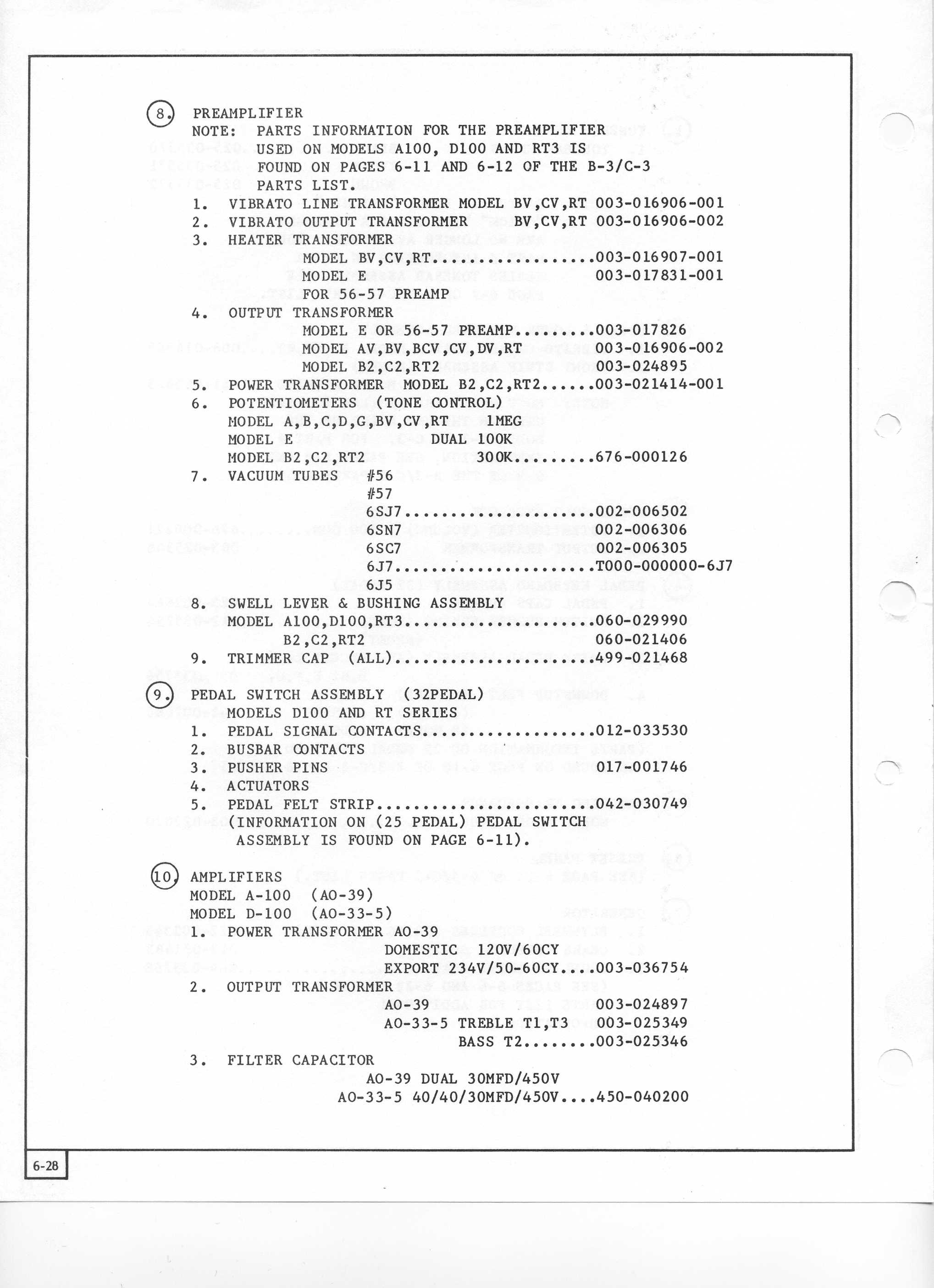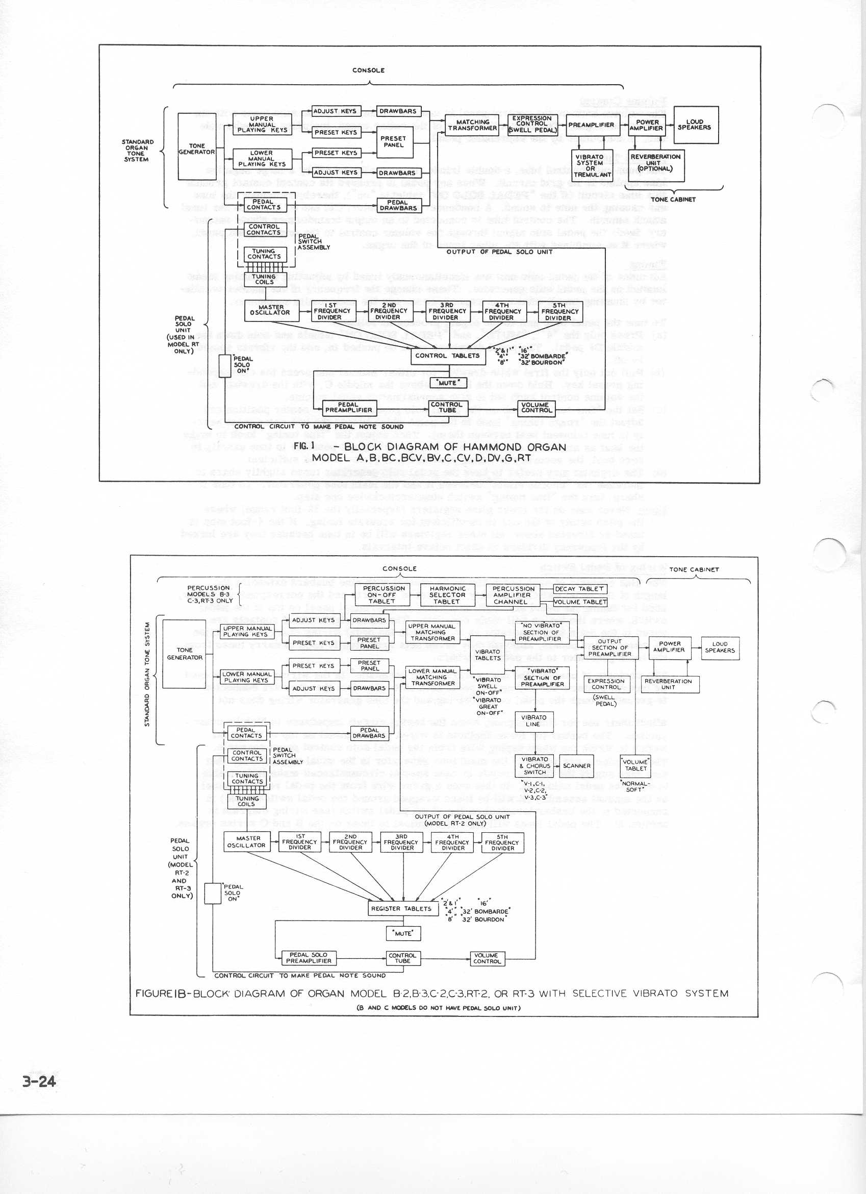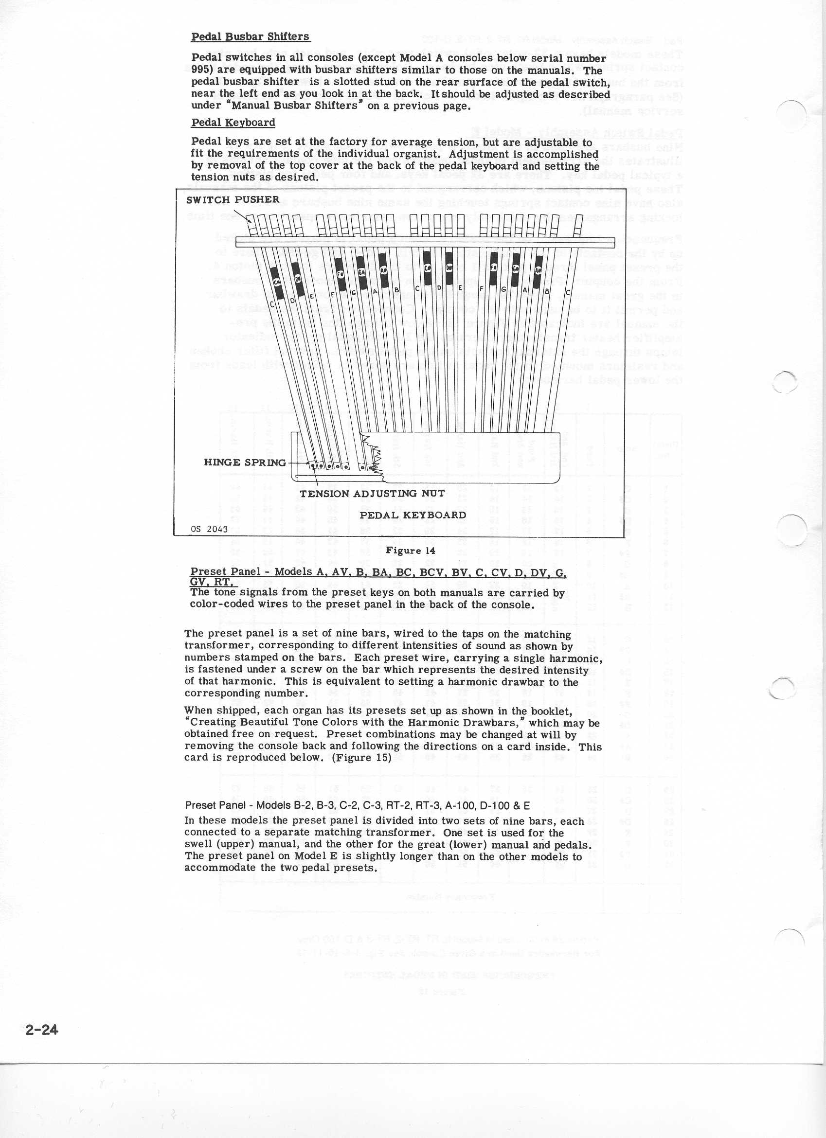 Manual Chassis Models A, AV, B, BA, BC, C, CV, D, DV, G, GV, RT 2-17 Key Contact Spring (Figure 2) 2-17 Manual Contacts (Figure 3) 2-17 Manual Chassis Models B-2, C-2, RT-2 Models B-3, C-3, RT-3, A-100, D-100 Model E 2-18 (manquante) Manual Wiring Models A, AV, B, BA, BC, BCV, C, CV, D, DV, E, G, GV, RT 2-19 Models B-2, B-3, C-2, C-3, RT-2, RT-3, A-100, D-100 2-19 Model M Series 2-19 Key & Frequecy Chart (Figure 4) 2-19 Pedal Switch Assembly (Figure 5) 2-20 Pedal Circuits (Figure 8 thru 12) 2-21, 2-22 Pedal Switch Assembly RT-1, 2, 3 & D-100 2-22A Pedal Circuits 2-22B, 2-22C Pedal Keyboard 2-22D Models RT, RT-2, RT-3 & D-100 2-23 Model E Pedal & Frequency Chart (Figure 13) 2-23 Pedal Keyboard (Figure 14) 2-24 PRESET PANELS Model A, AV, B, BA, BC, BCV, BV,