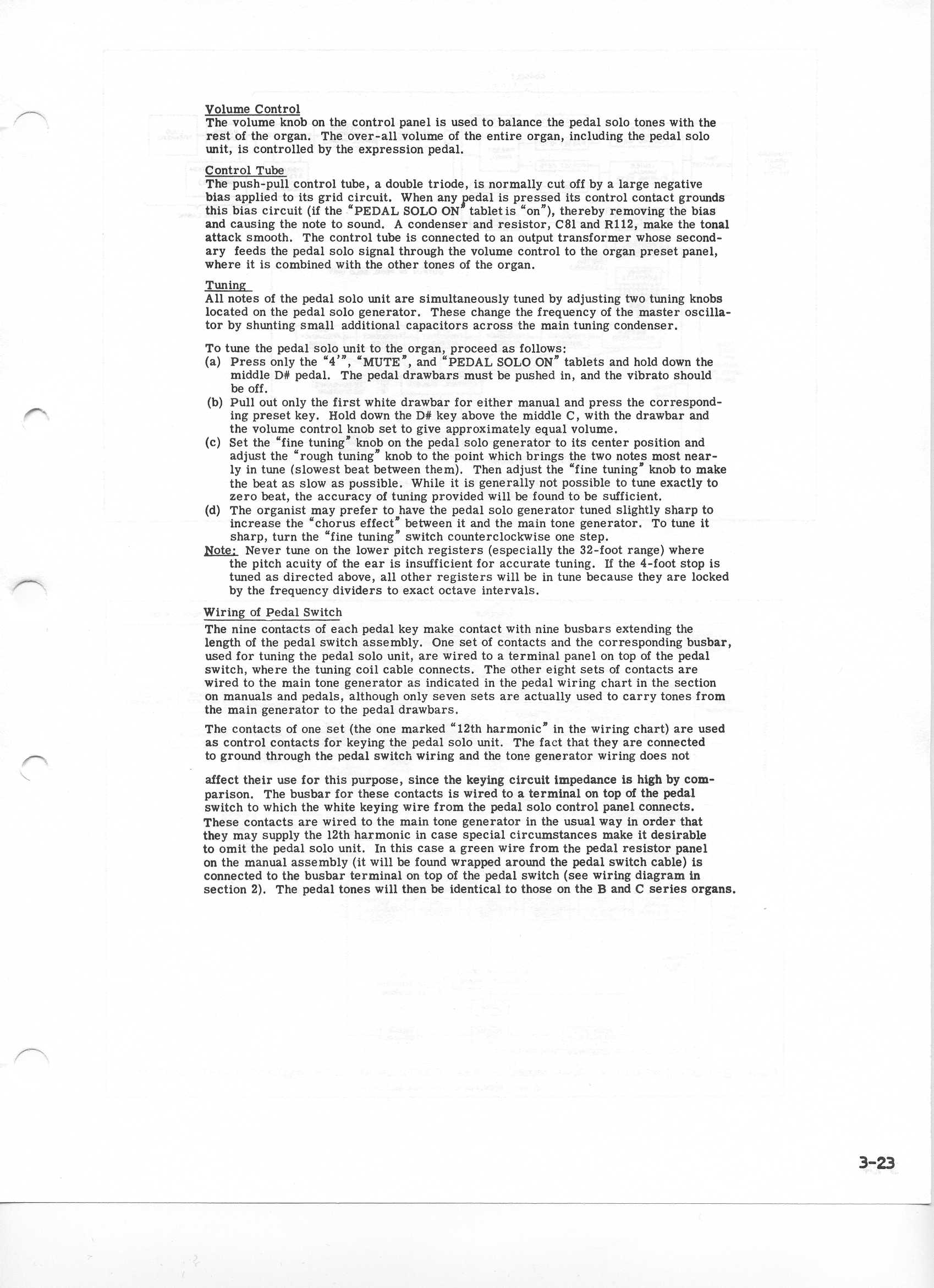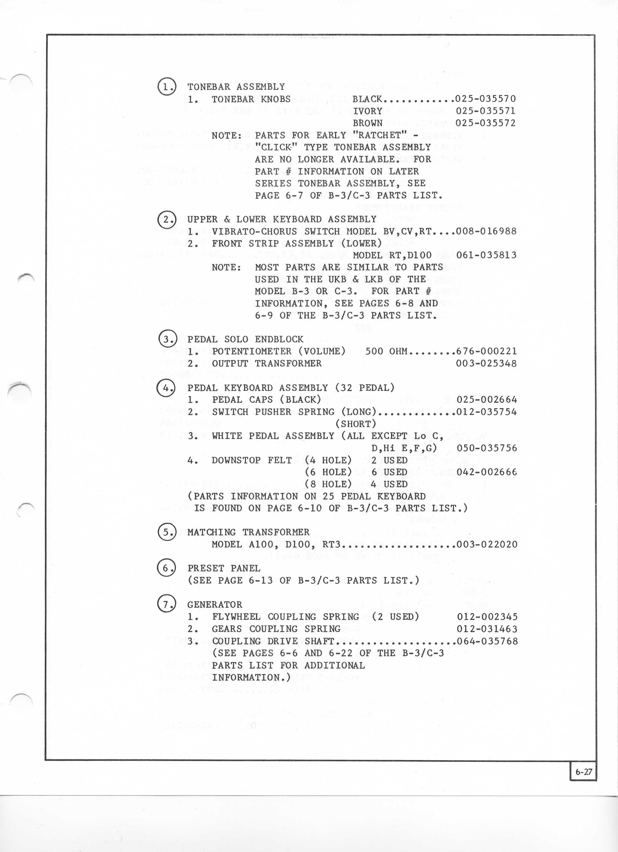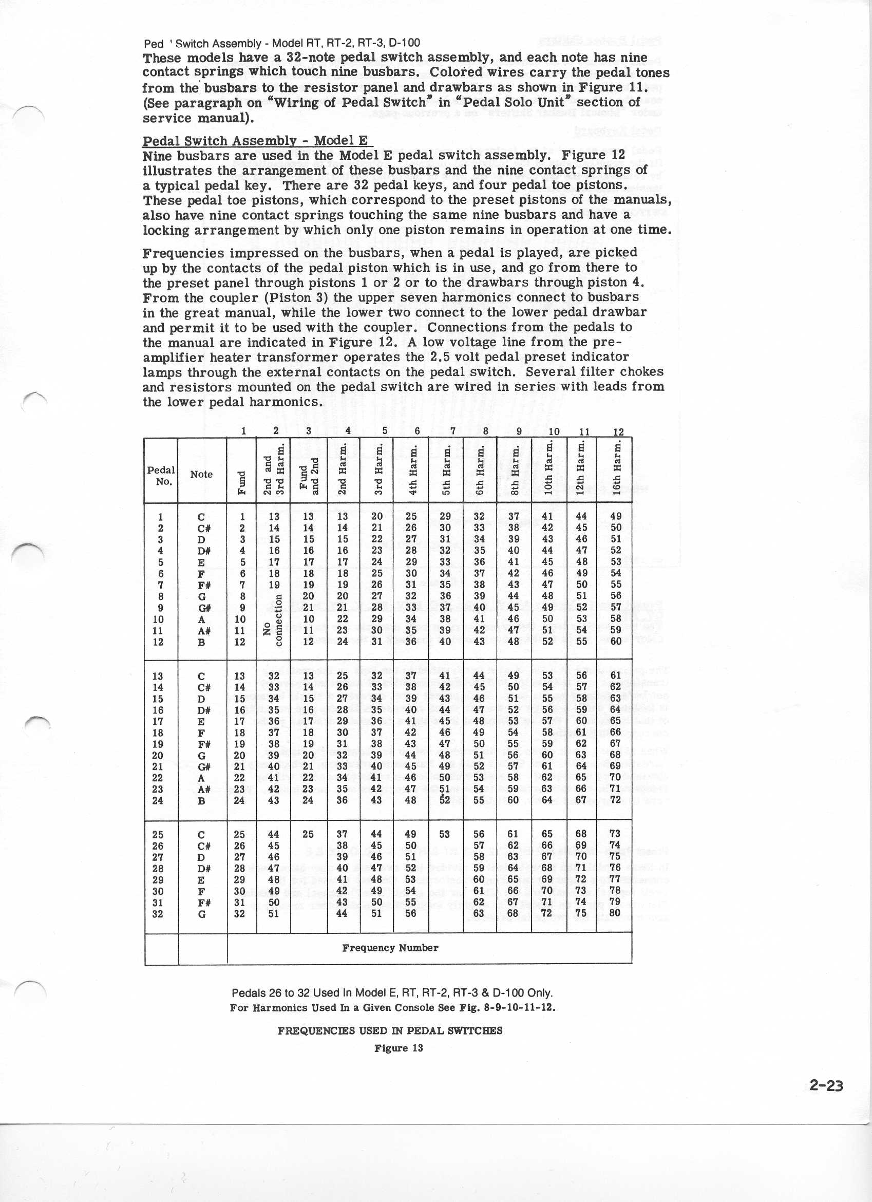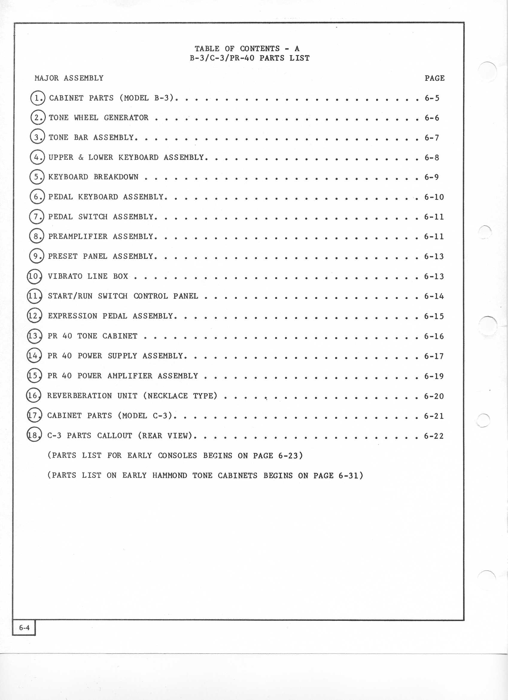 Manual Chassis Models A, AV, B, BA, BC, C, CV, D, DV, G, GV, RT 2-17 Key Contact Spring (Figure 2) 2-17 Manual Contacts (Figure 3) 2-17 Manual Chassis Models B-2, C-2, RT-2 Models B-3, C-3, RT-3, A-100, D-100 Model E 2-18 (manquante) Manual Wiring Models A, AV, B, BA, BC, BCV, C, CV, D, DV, E, G, GV, RT 2-19 Models B-2, B-3, C-2, C-3, RT-2, RT-3, A-100, D-100 2-19 Model M Series 2-19 Key & Frequecy Chart (Figure 4) 2-19 Pedal Switch Assembly (Figure 5) 2-20 Pedal Circuits (Figure 8 thru 12) 2-21, 2-22 Pedal Switch Assembly RT-1, 2, 3 & D-100 2-22A Pedal Circuits 2-22B, 2-22C Pedal Keyboard 2-22D Models RT, RT-2, RT-3 & D-100 2-23 Model E Pedal & Frequency Chart (Figure 13) 2-23 Pedal Keyboard (Figure 14) 2-24 PRESET PANELS Model A, AV, B, BA, BC, BCV, BV,