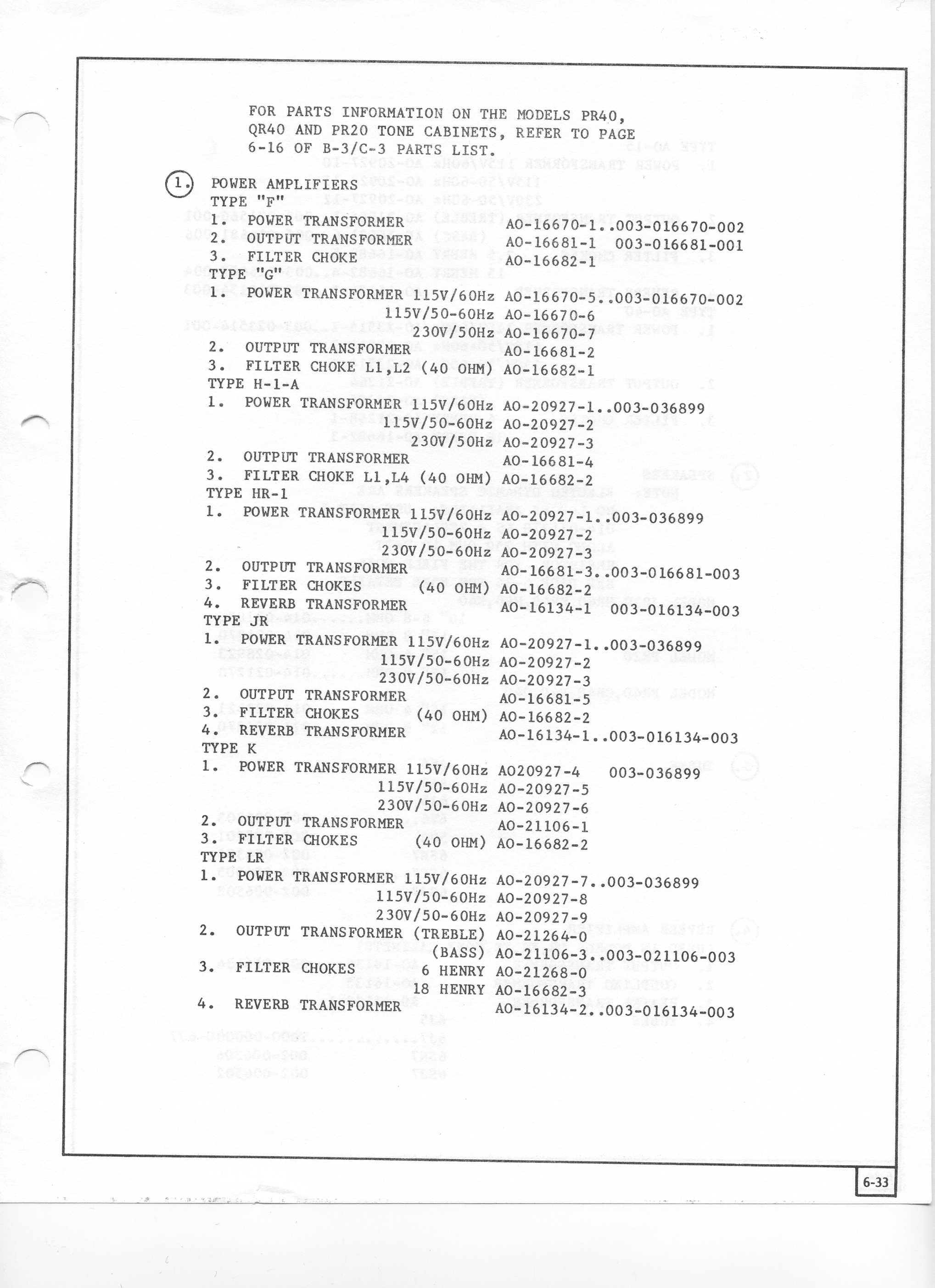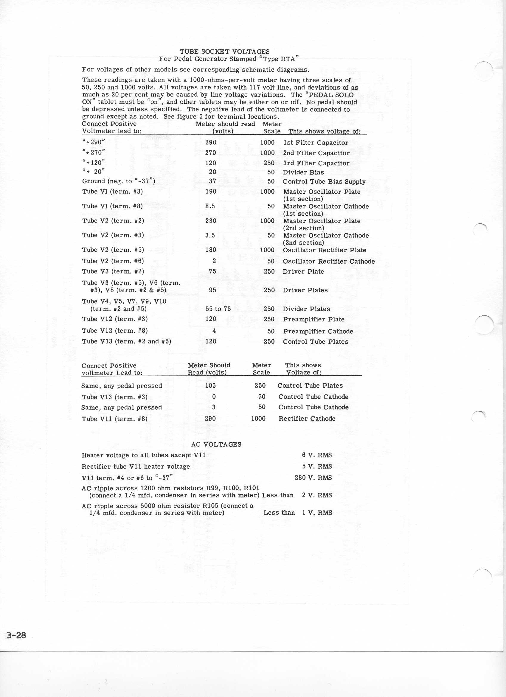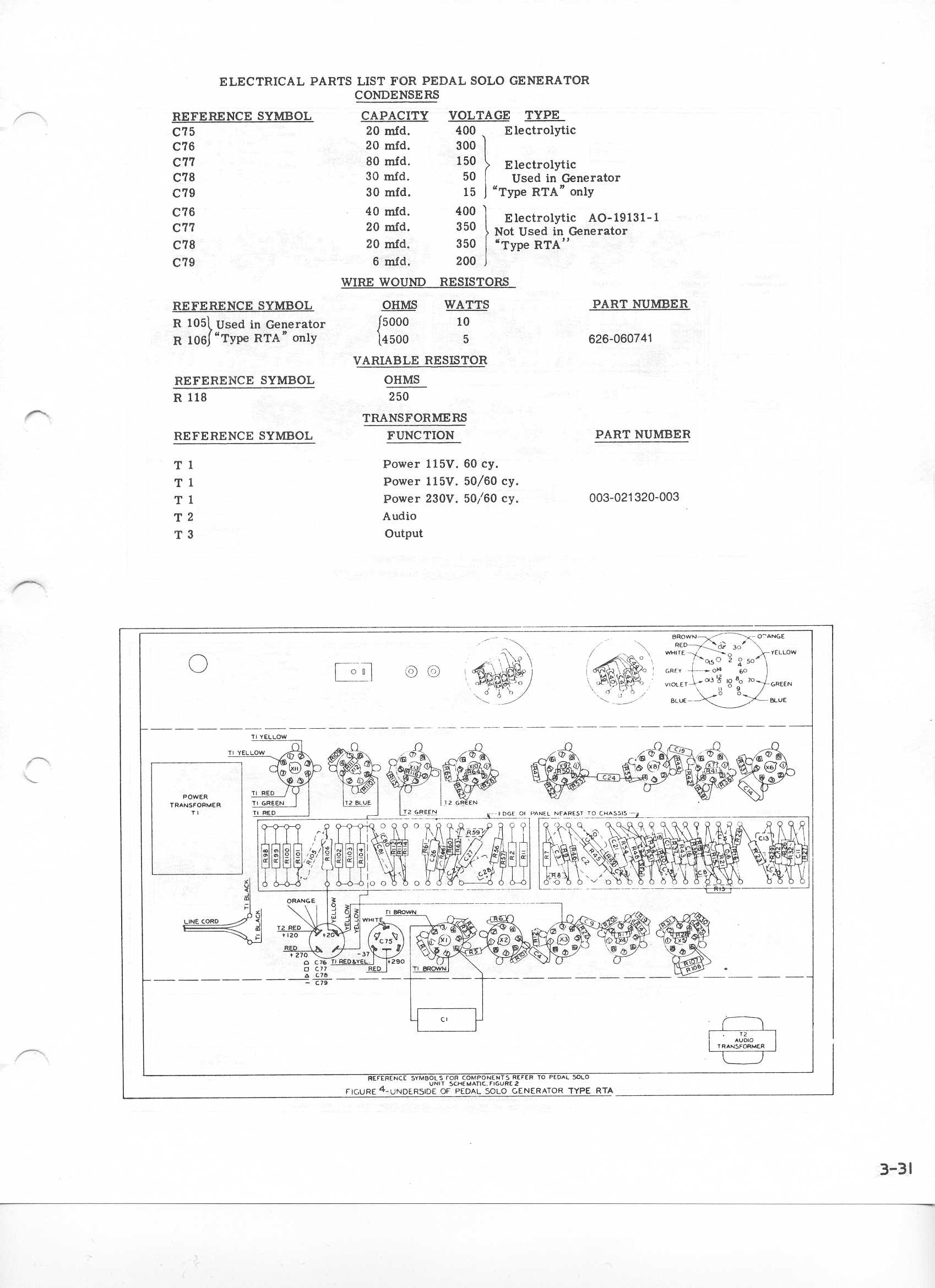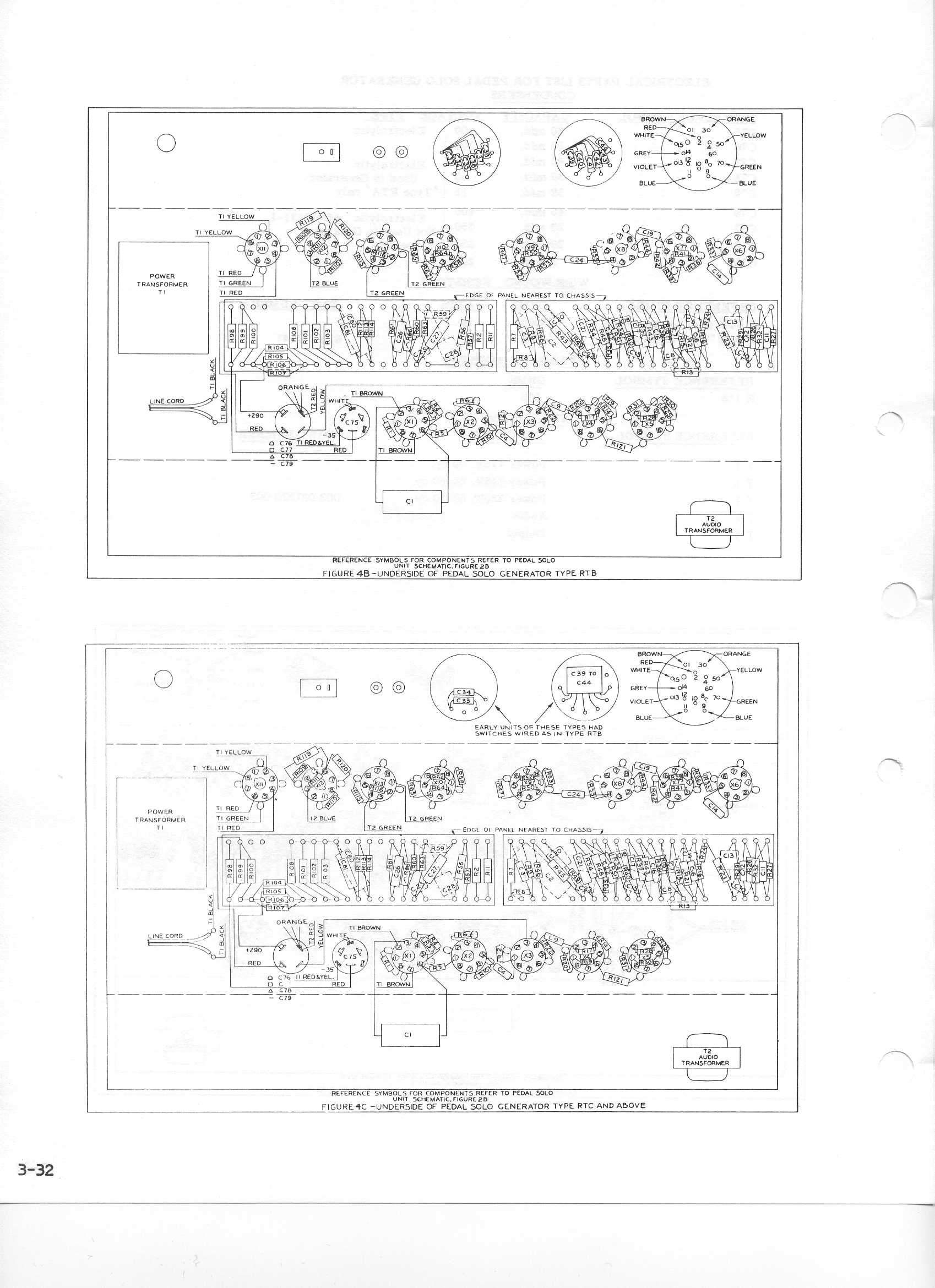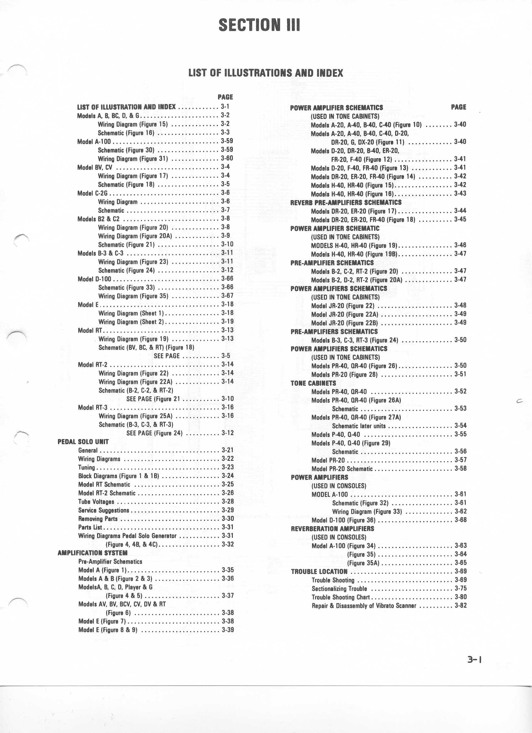 Wiring Diagrams 3-22 Tuning 3-23 Block Diagrams (Figure 1 & 1B) 3-24 Model RT Schematic 3-25 Model RT-2 Schematic 3-26, 3-27 Tube Voltages 3-28 Service Suggestions 3-29 (manquante) Removing Parts 3-30 Parts List 3-31 Wiring Diagrams Pedal Solo Generator 3-31 (Figure 4, 4B, & 4C) 3-32, 3-33, 3-34 AMPLIFICATION SYSTEM (thumbnails 11) |