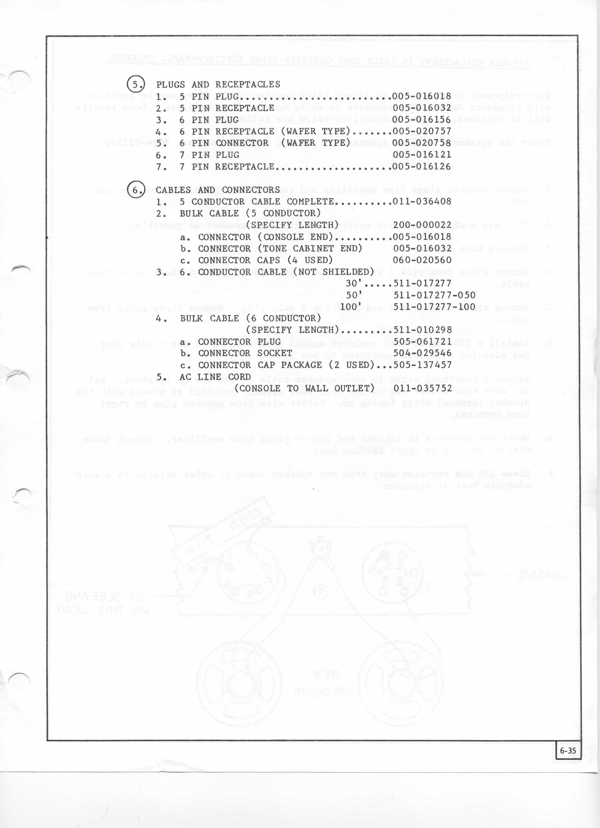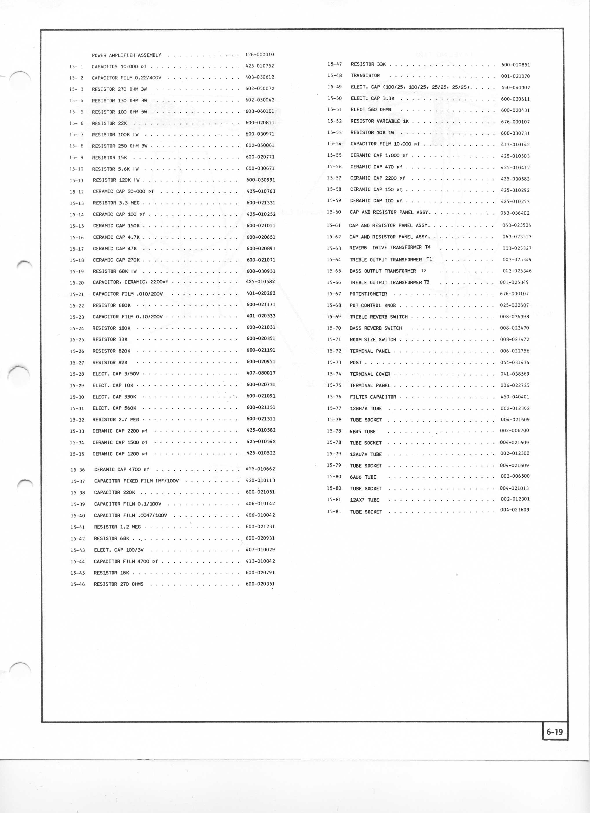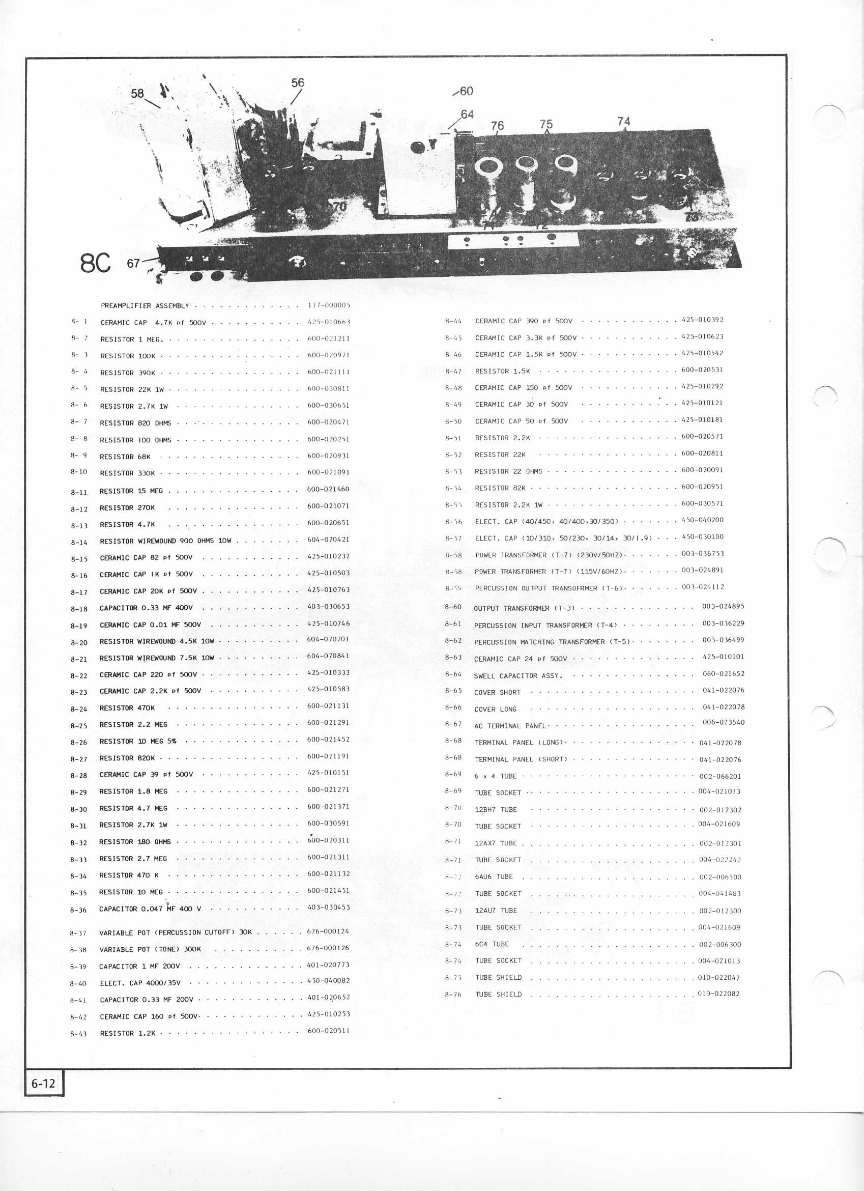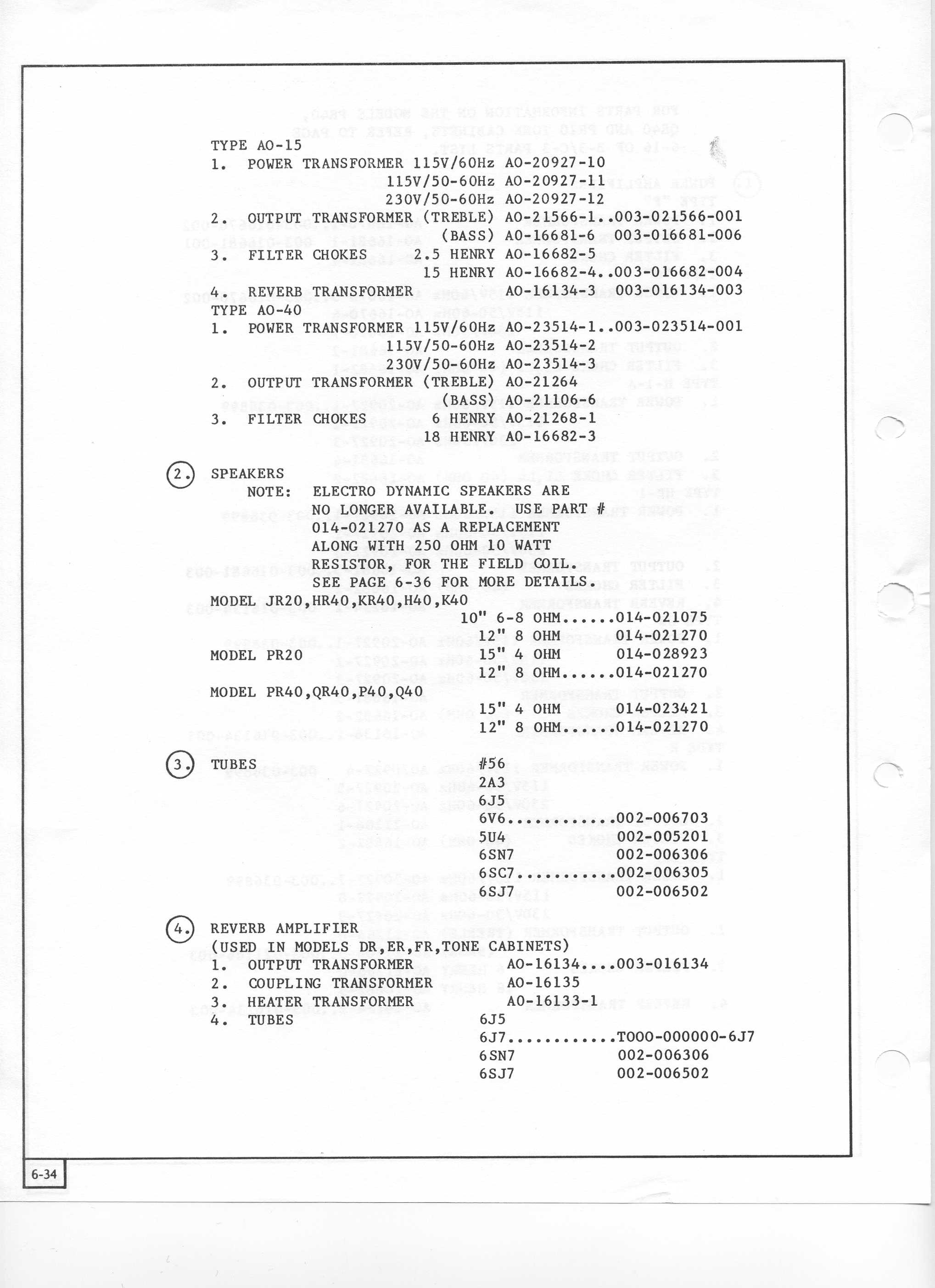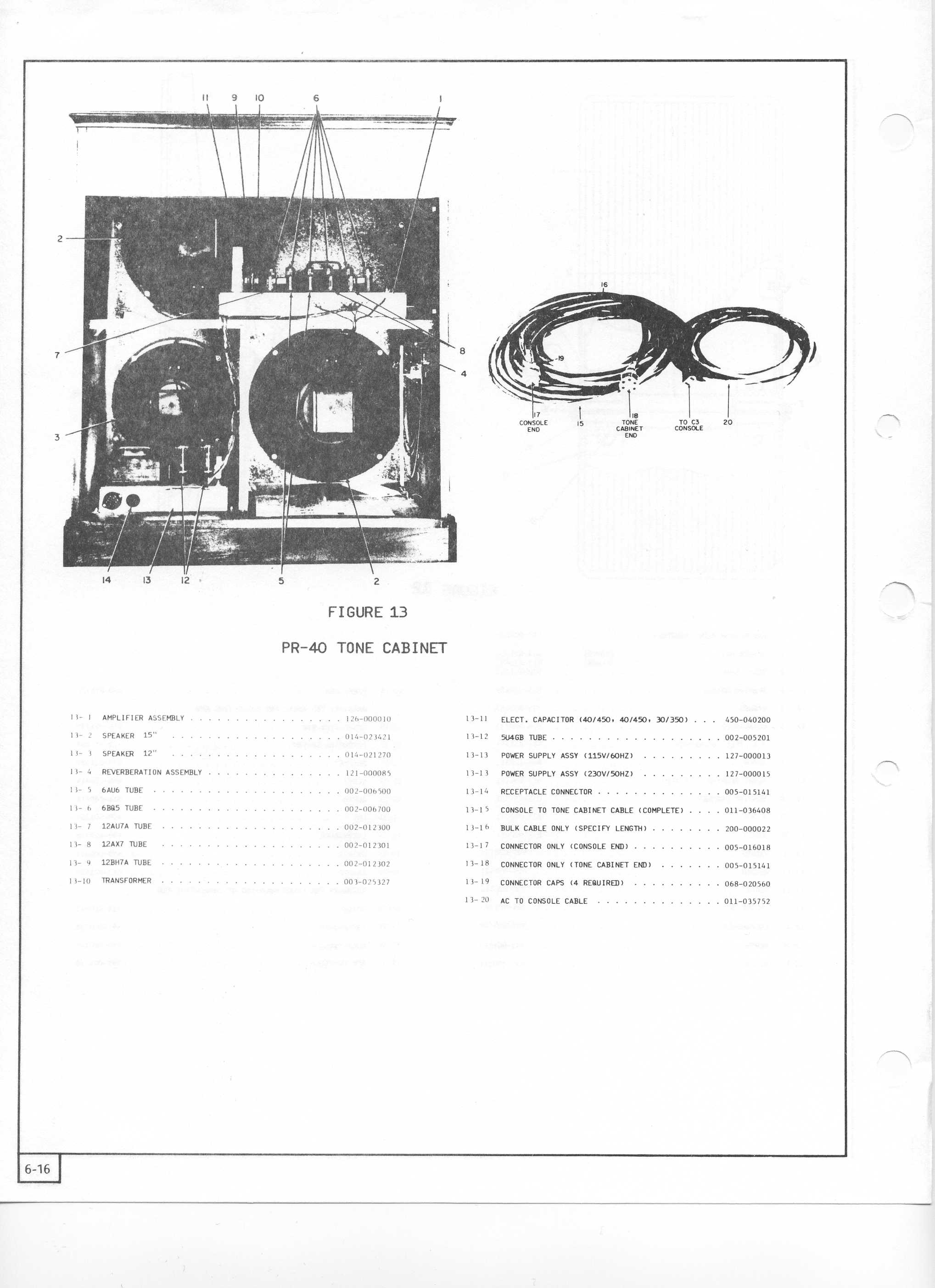 Wiring Diagrams 3-22 Tuning 3-23 Block Diagrams (Figure 1 & 1B) 3-24 Model RT Schematic 3-25 Model RT-2 Schematic 3-26, 3-27 Tube Voltages 3-28 Service Suggestions 3-29 (manquante) Removing Parts 3-30 Parts List 3-31 Wiring Diagrams Pedal Solo Generator 3-31 (Figure 4, 4B, & 4C) 3-32, 3-33, 3-34 AMPLIFICATION SYSTEM (thumbnails 11) |