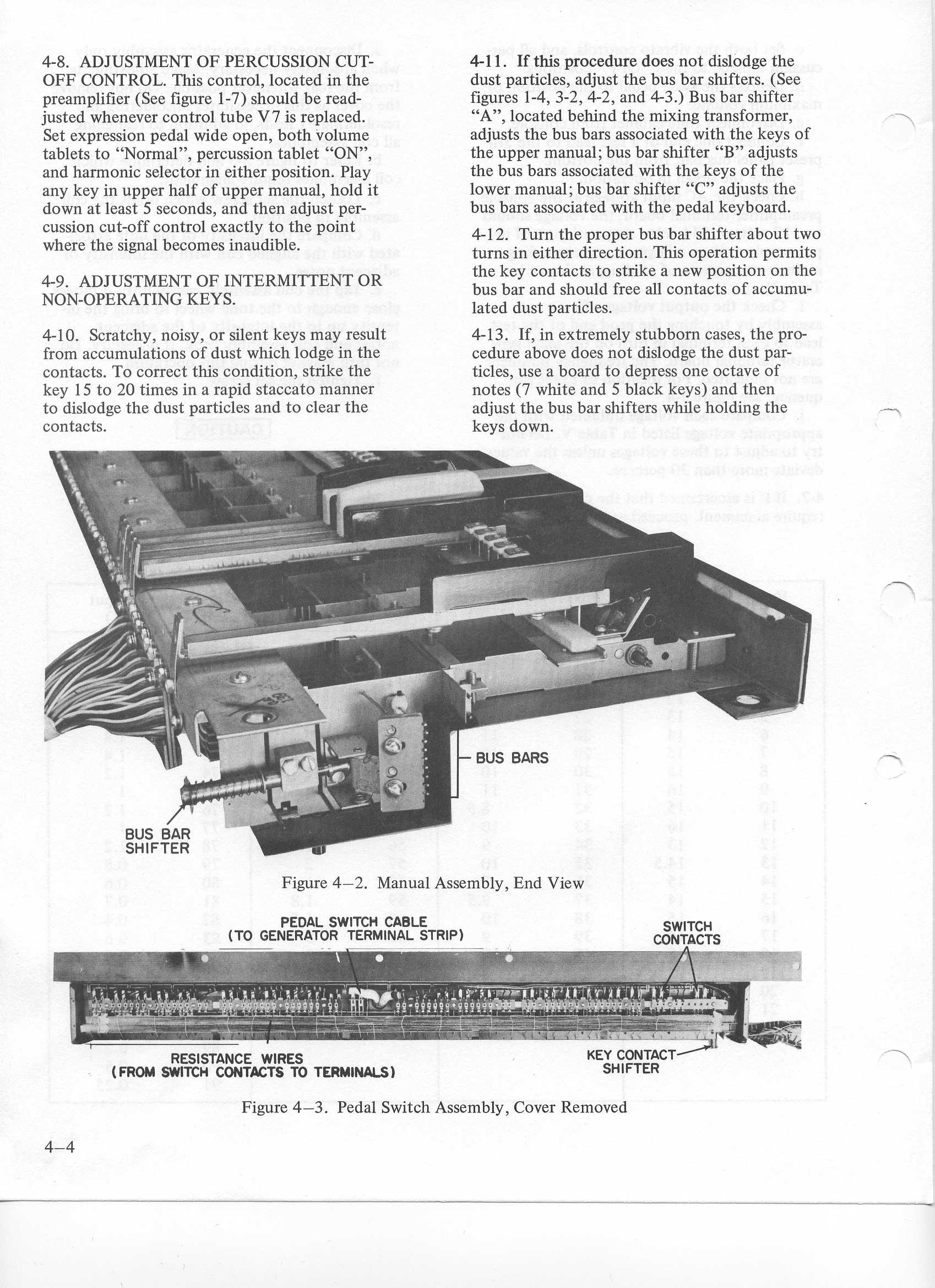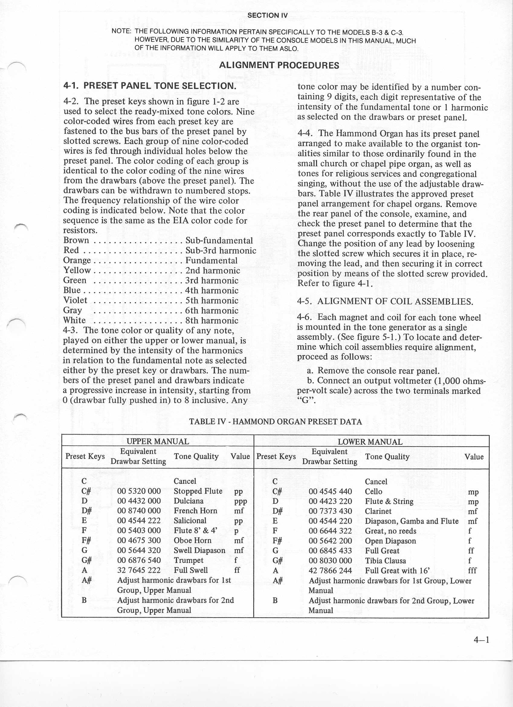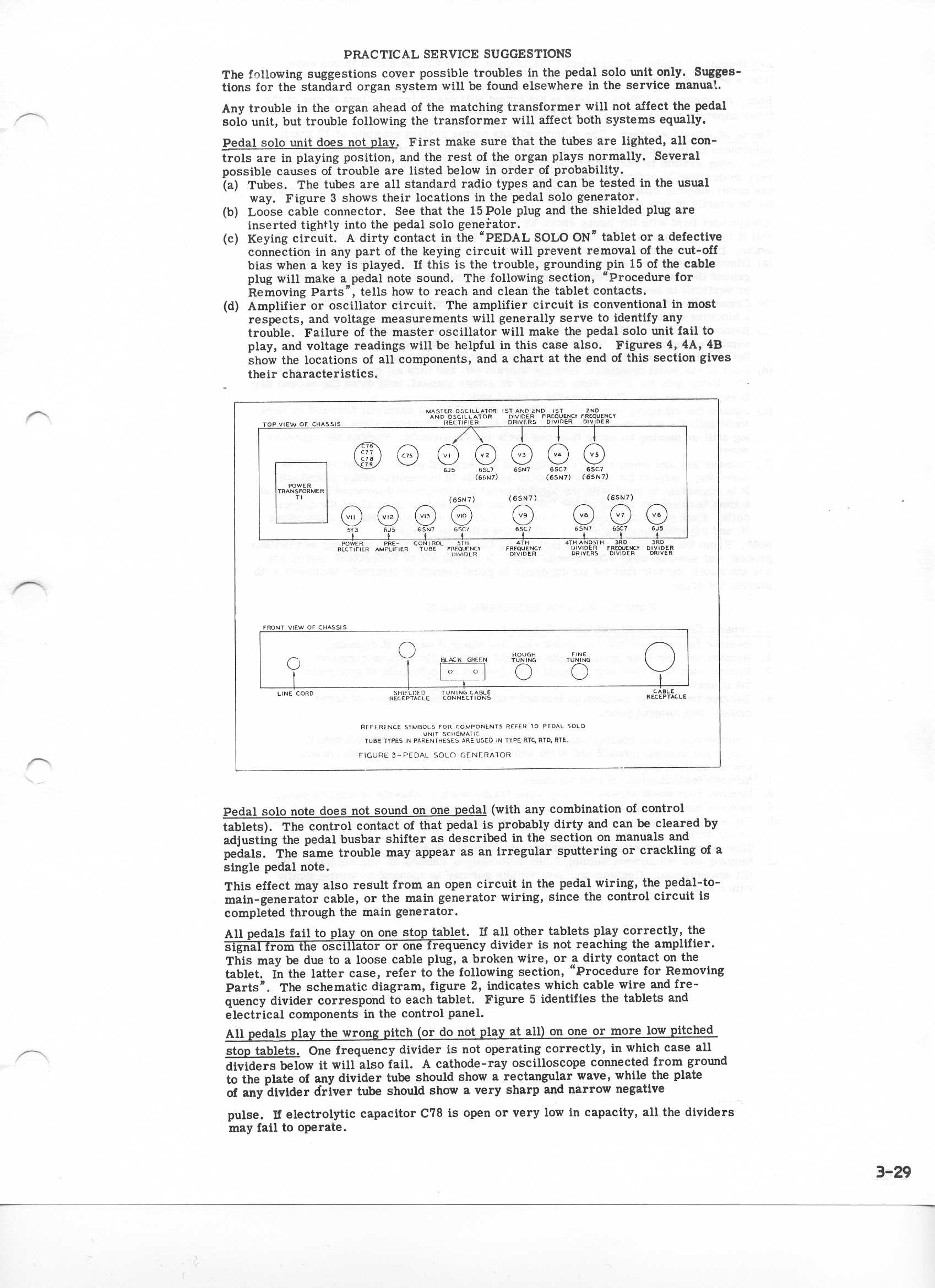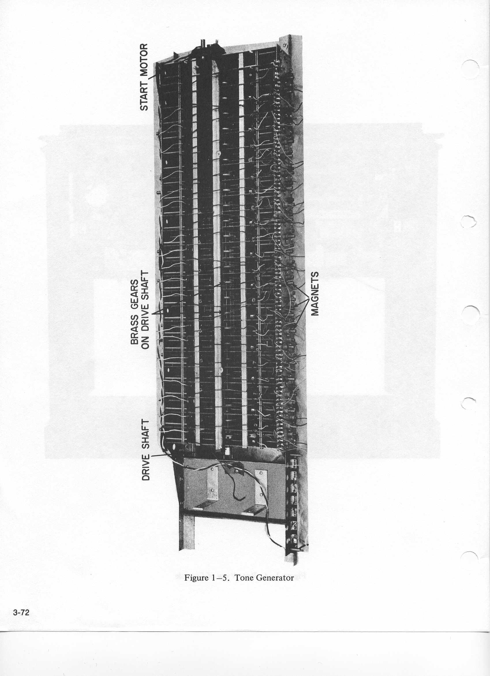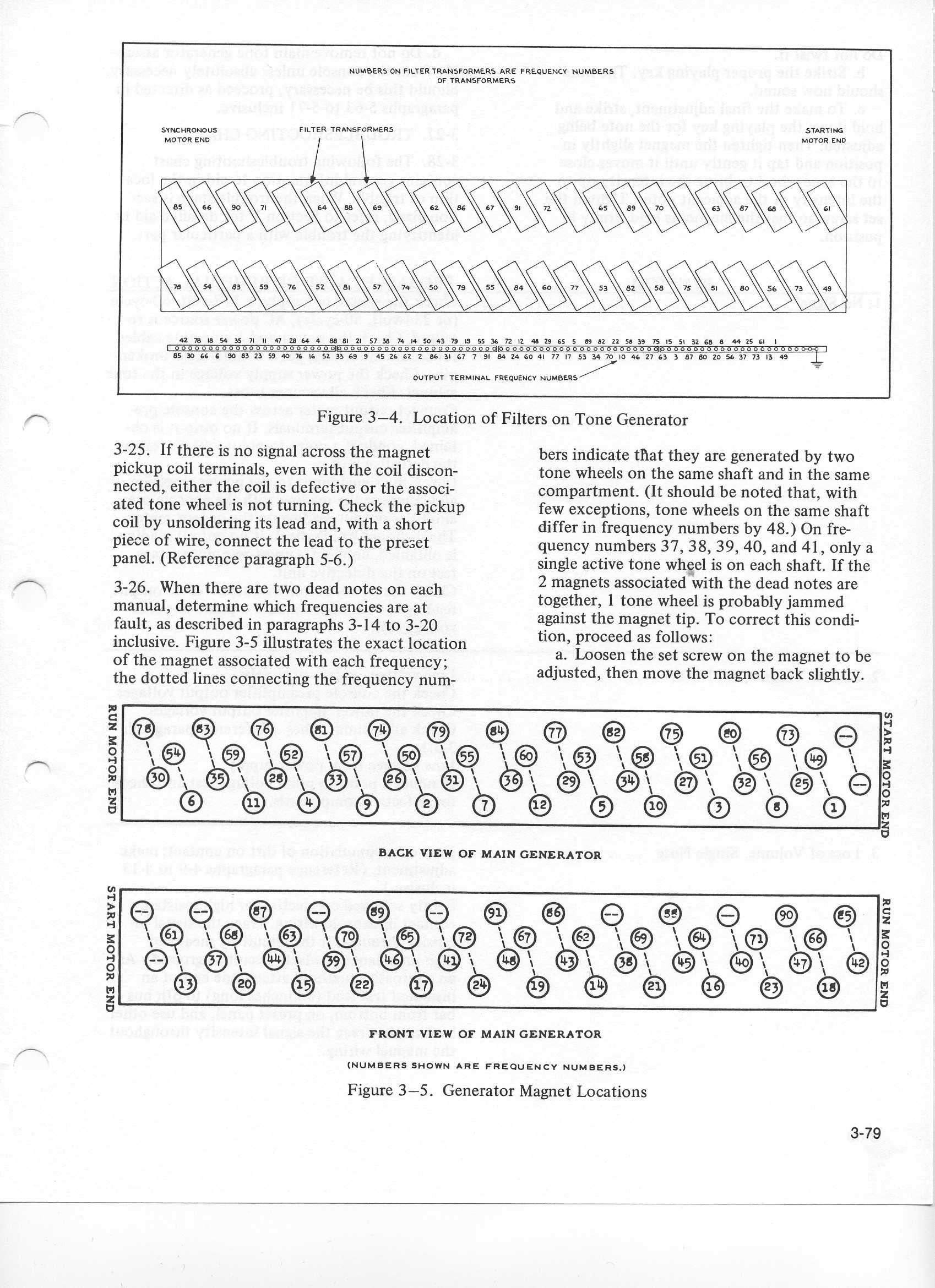 , 3-81fig 3-4 location of filters on Tone Gen, fig 3-5 generator magnet locations 3-79 Repair & Disassembly of Vibrato Scanner 3-82, 3-83, 3-84, 3-85 SECTION IV - ALIGNMENT PROCEDURES (thumbnails 14) Preset Panel Tone