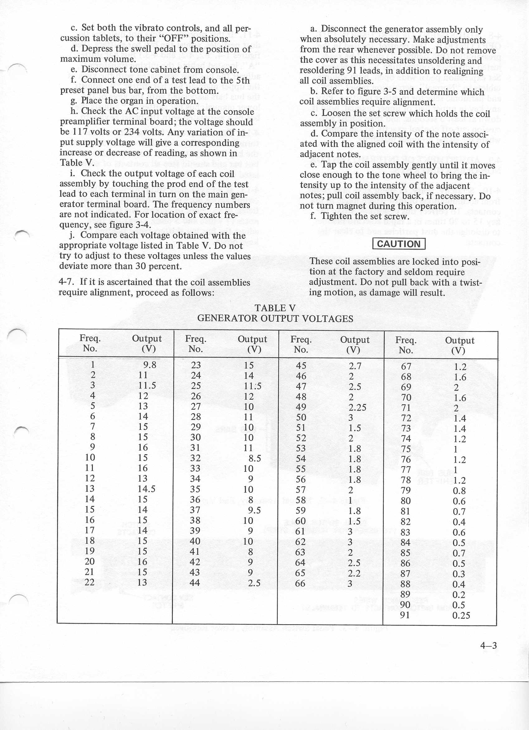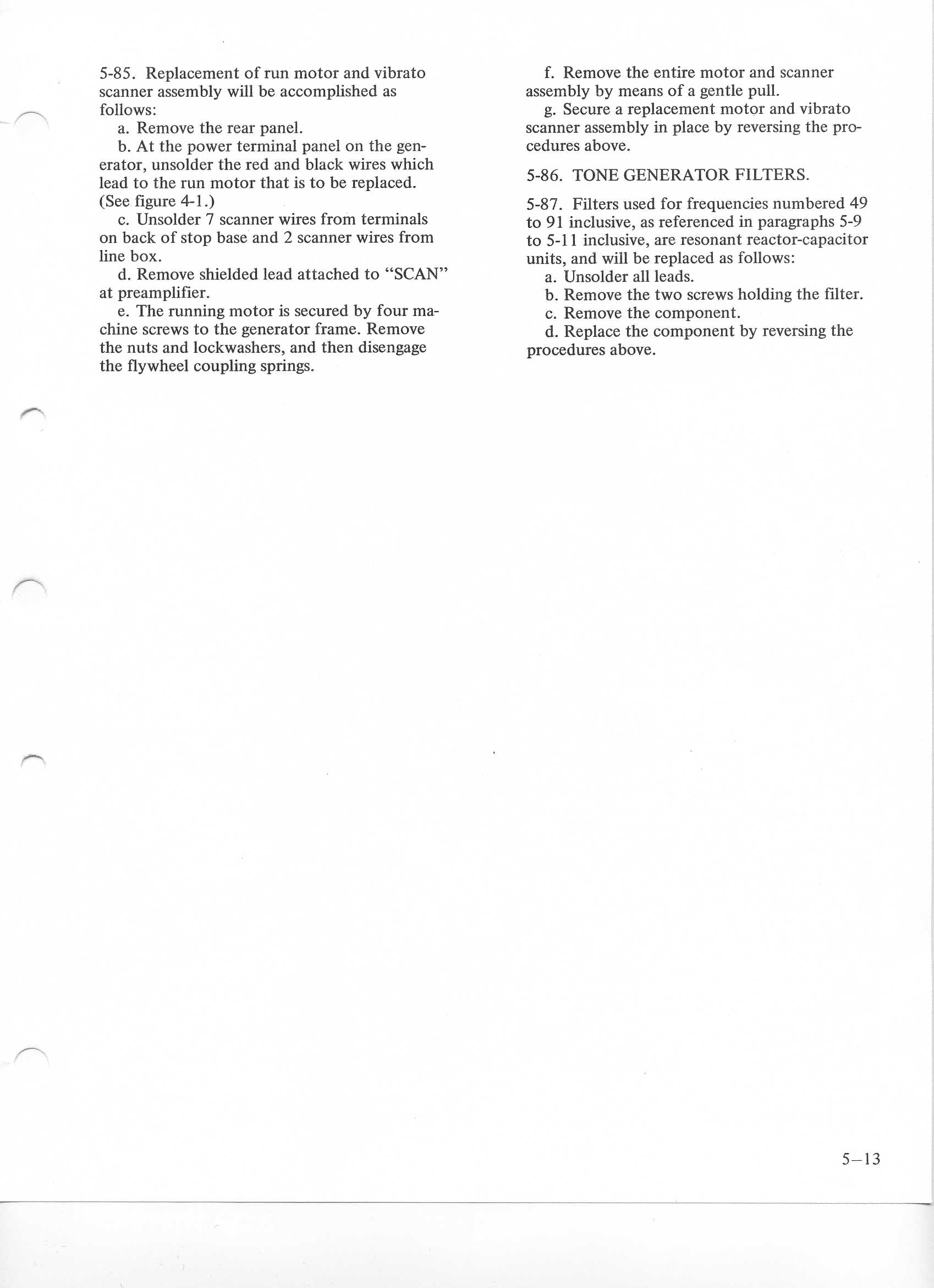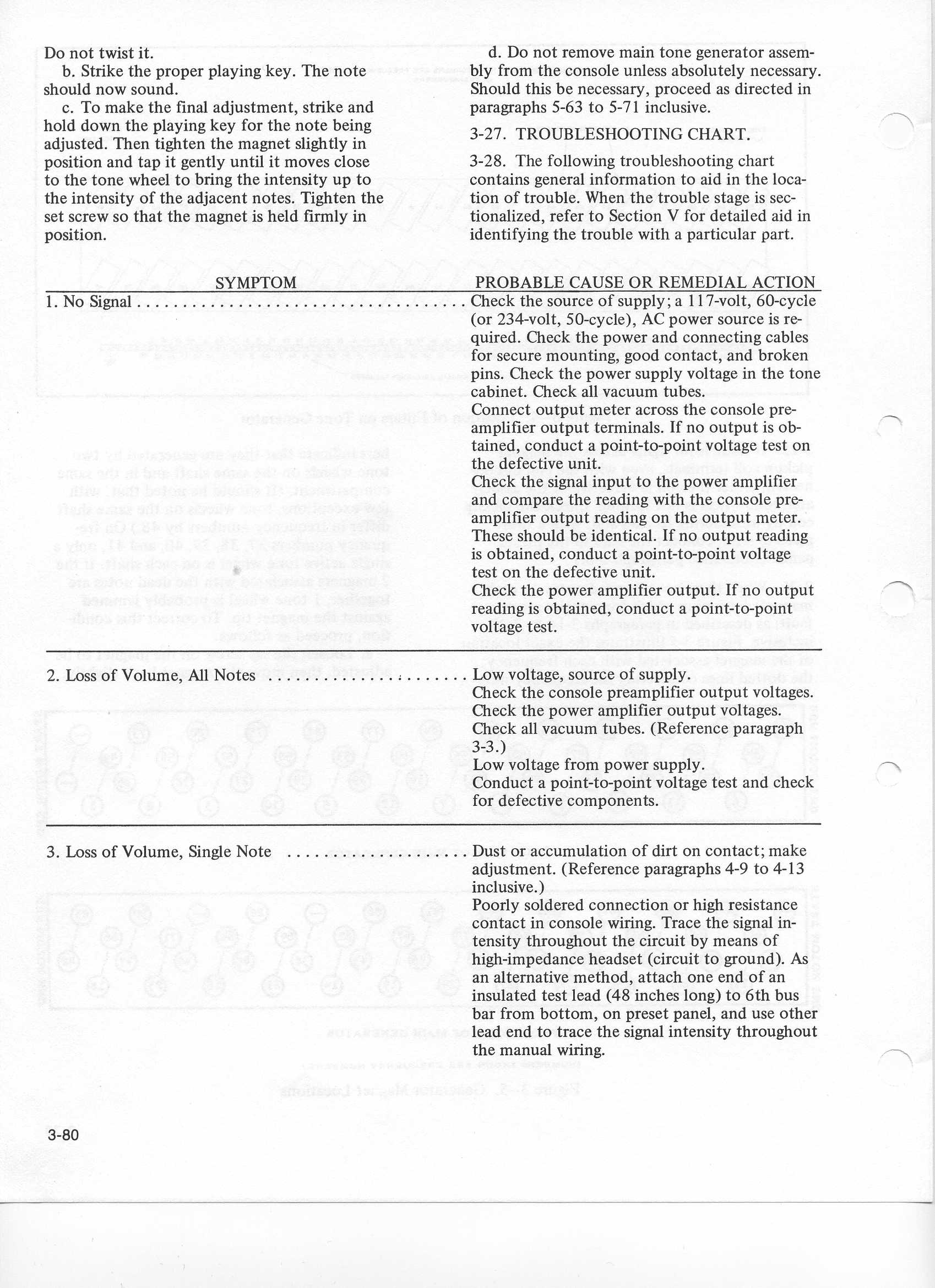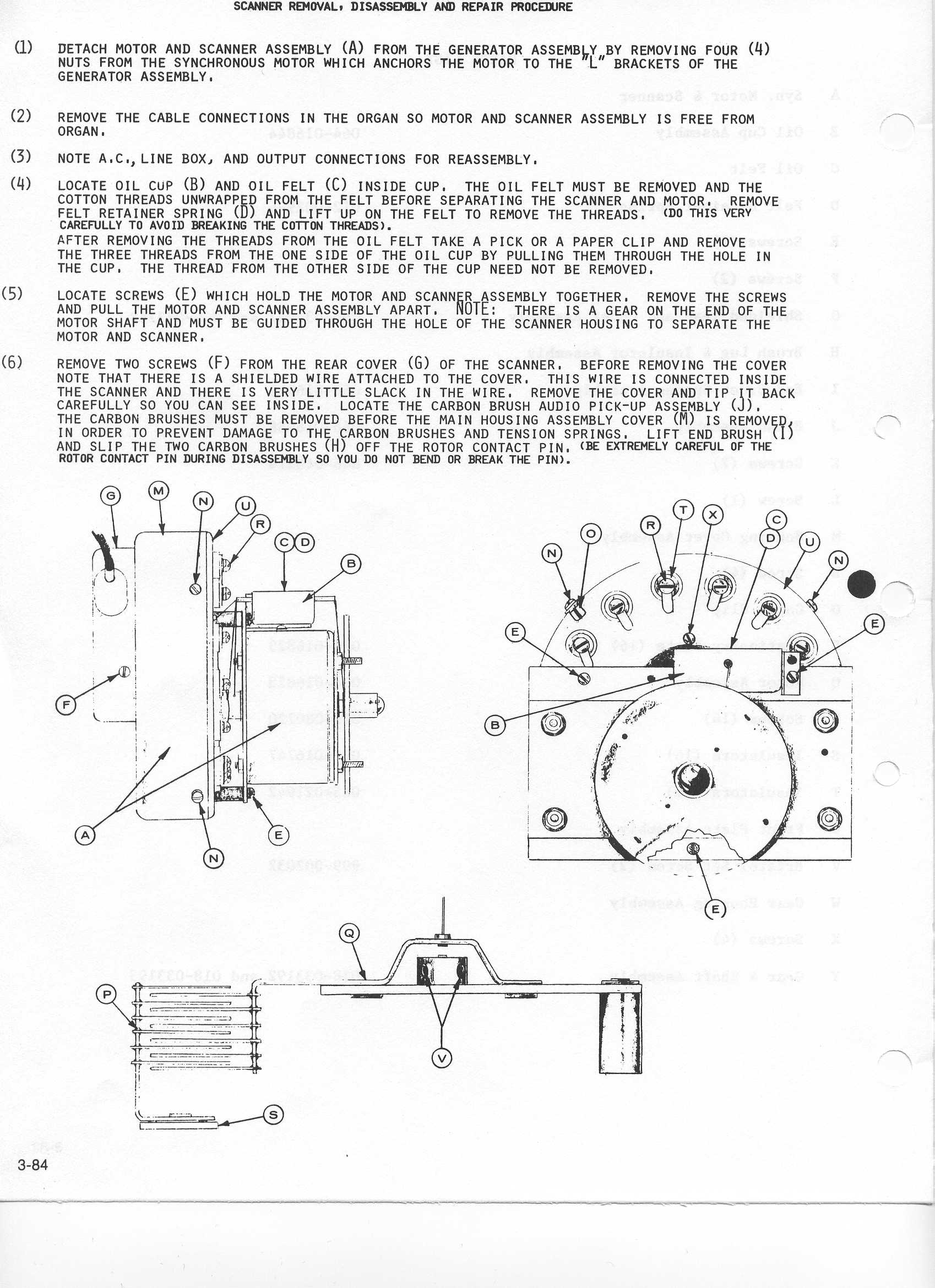 , 3-81fig 3-4 location of filters on Tone Gen, fig 3-5 generator magnet locations 3-79 Repair & Disassembly of Vibrato Scanner 3-82, 3-83, 3-84, 3-85 SECTION IV - ALIGNMENT PROCEDURES (thumbnails 14) Preset Panel Tone
