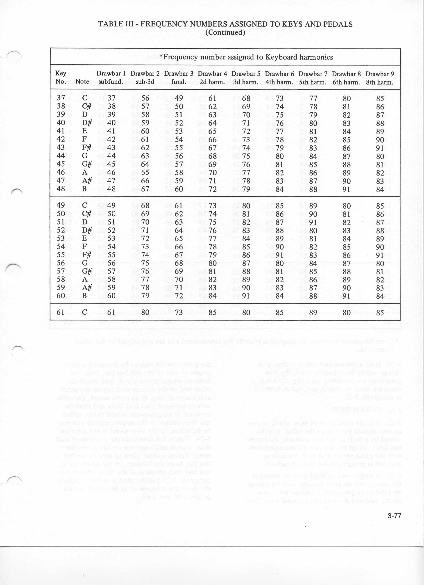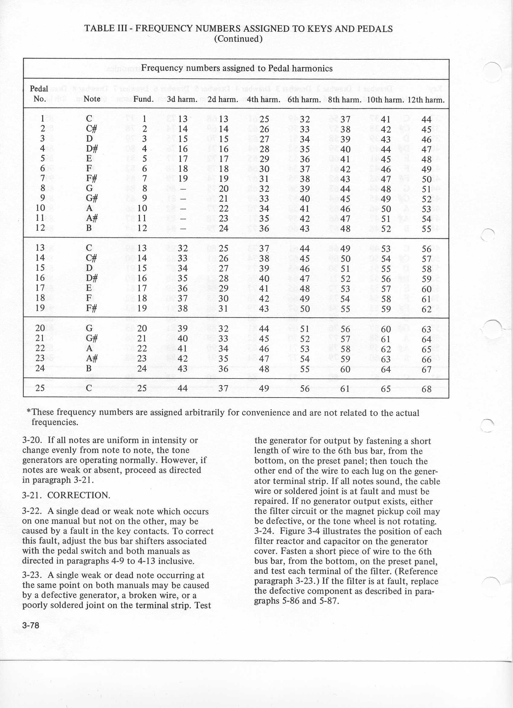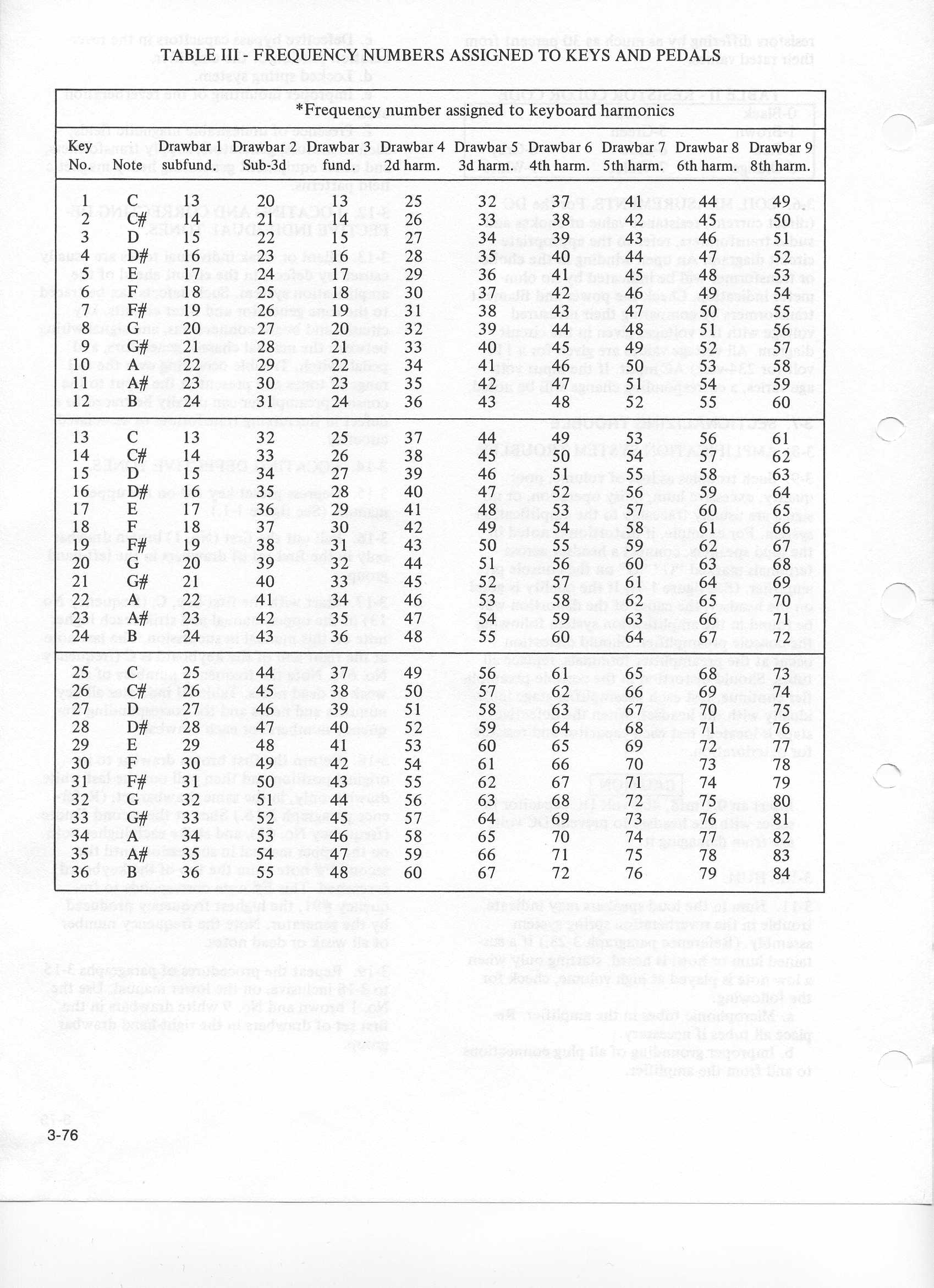 III frequency numbers assigned to keys and pedals 3-76, 3-77,