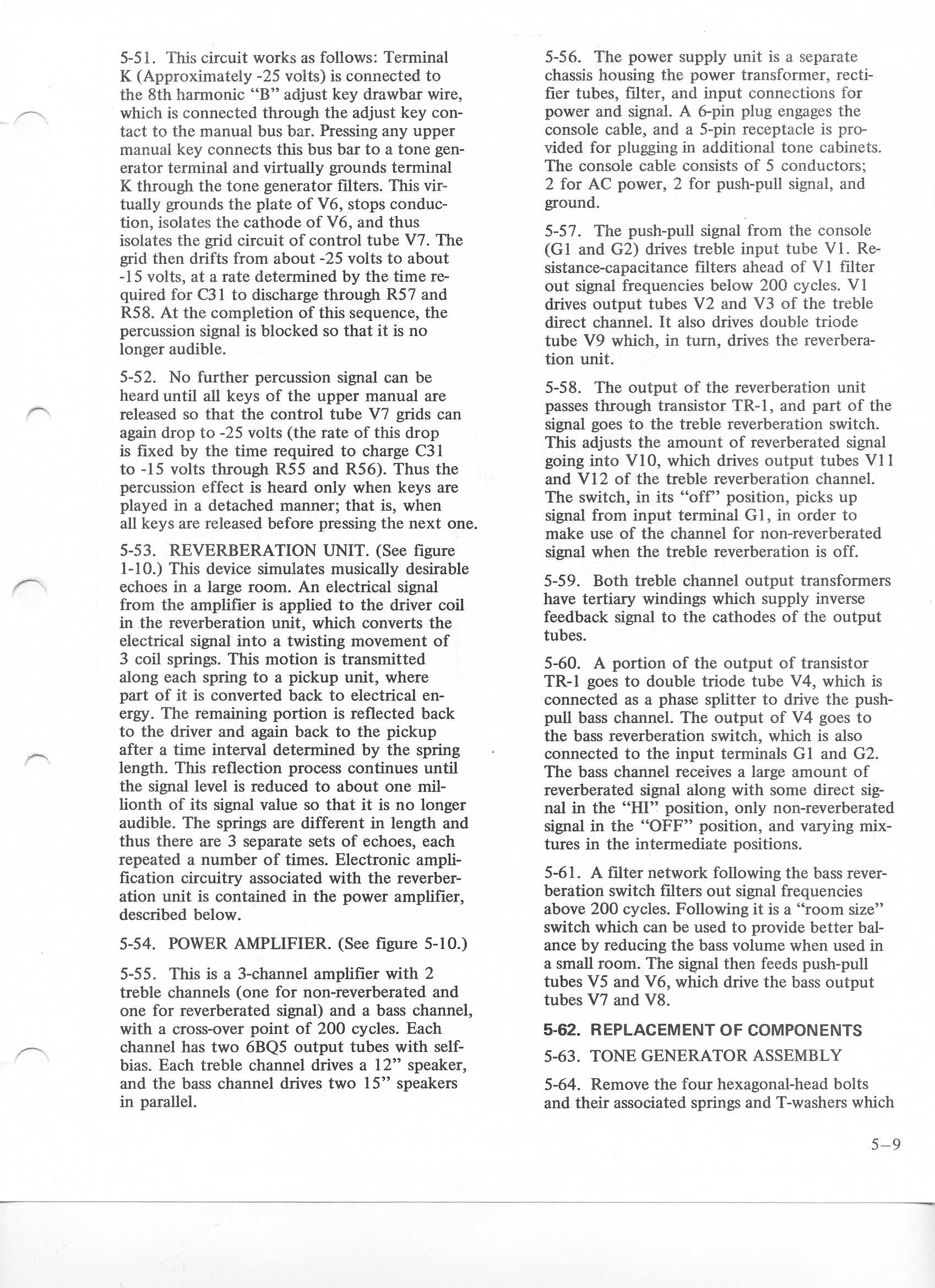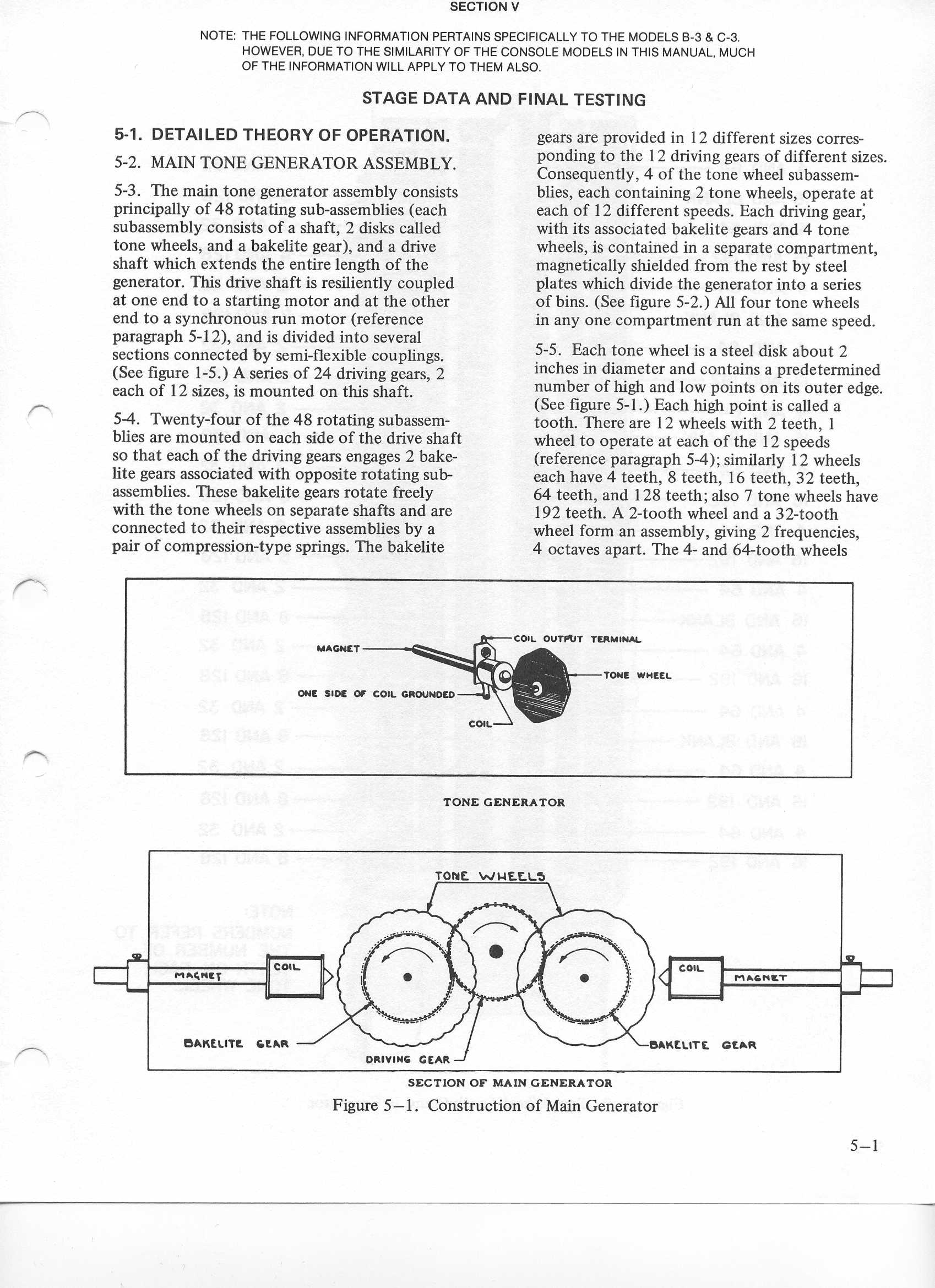 Alignment of Coil Assemblies 4-1, 4-3 Adjustment of Percussion Cut-Off Control 4-4 Adjustment of Intermittent or Non-Operating Keys 4-4 SECTION V - STAGE DATA AND FINAL TESTING 5-1 Detailed Theory of