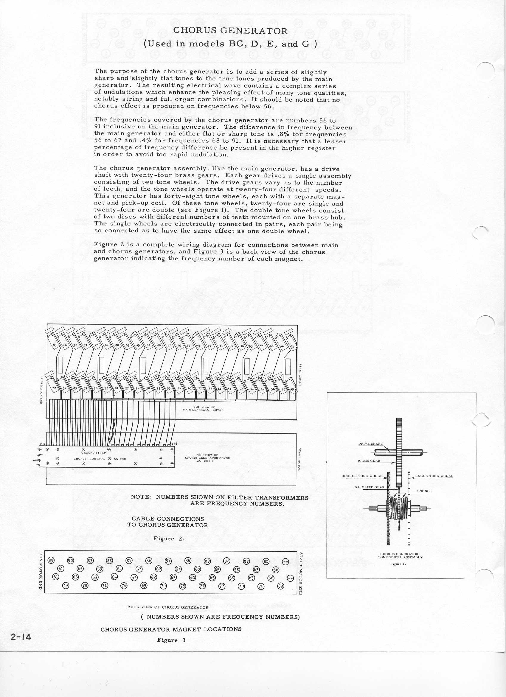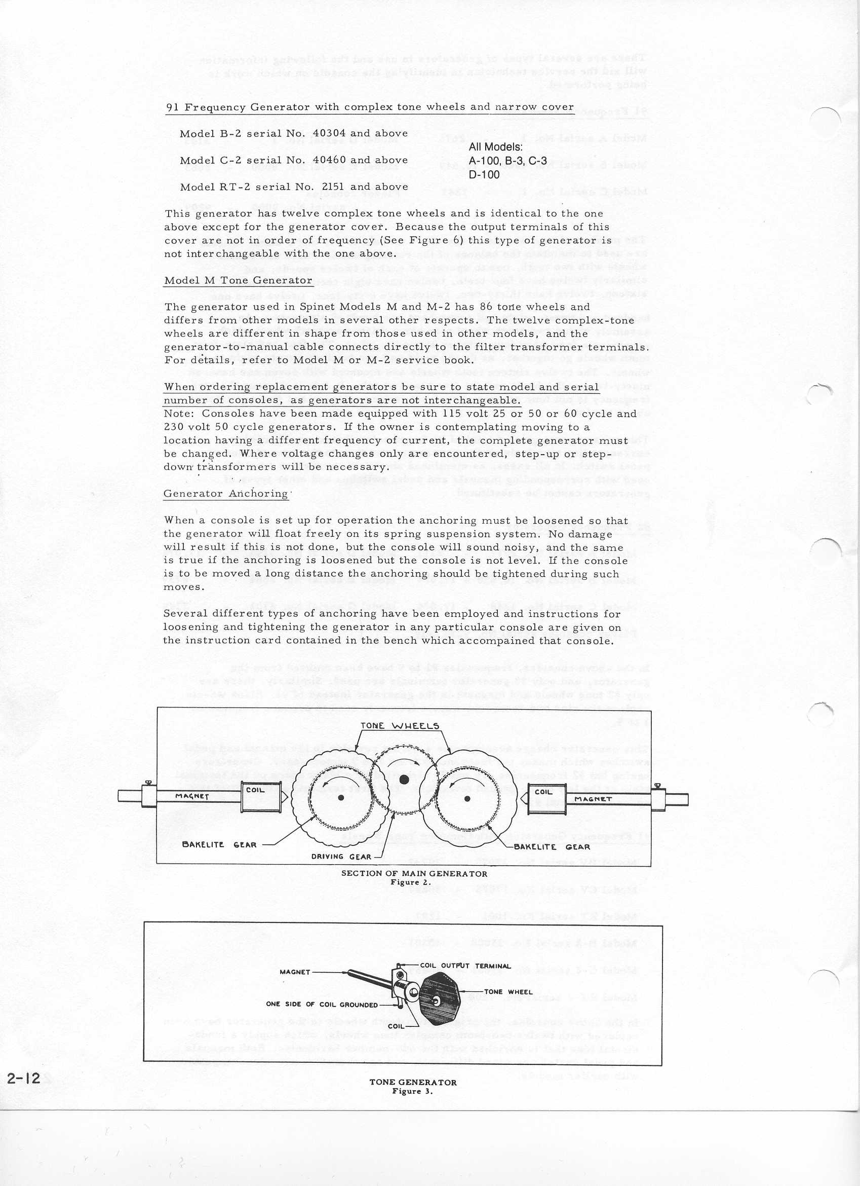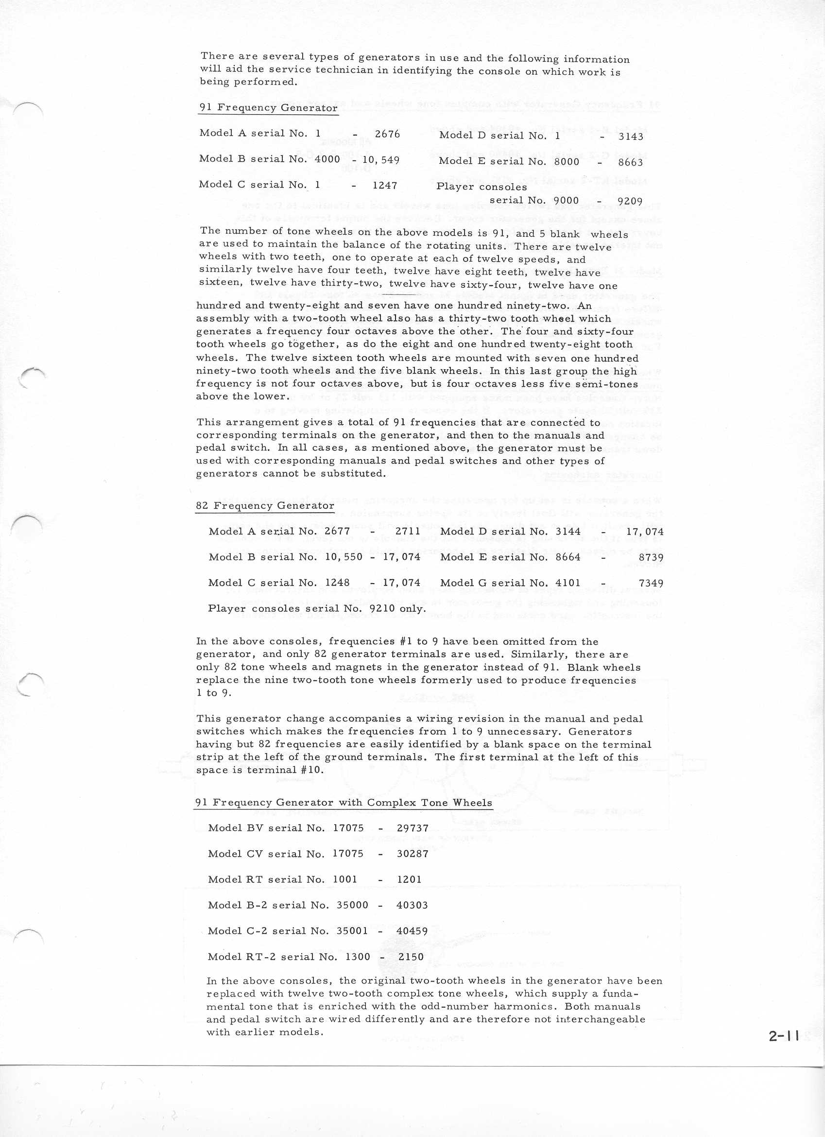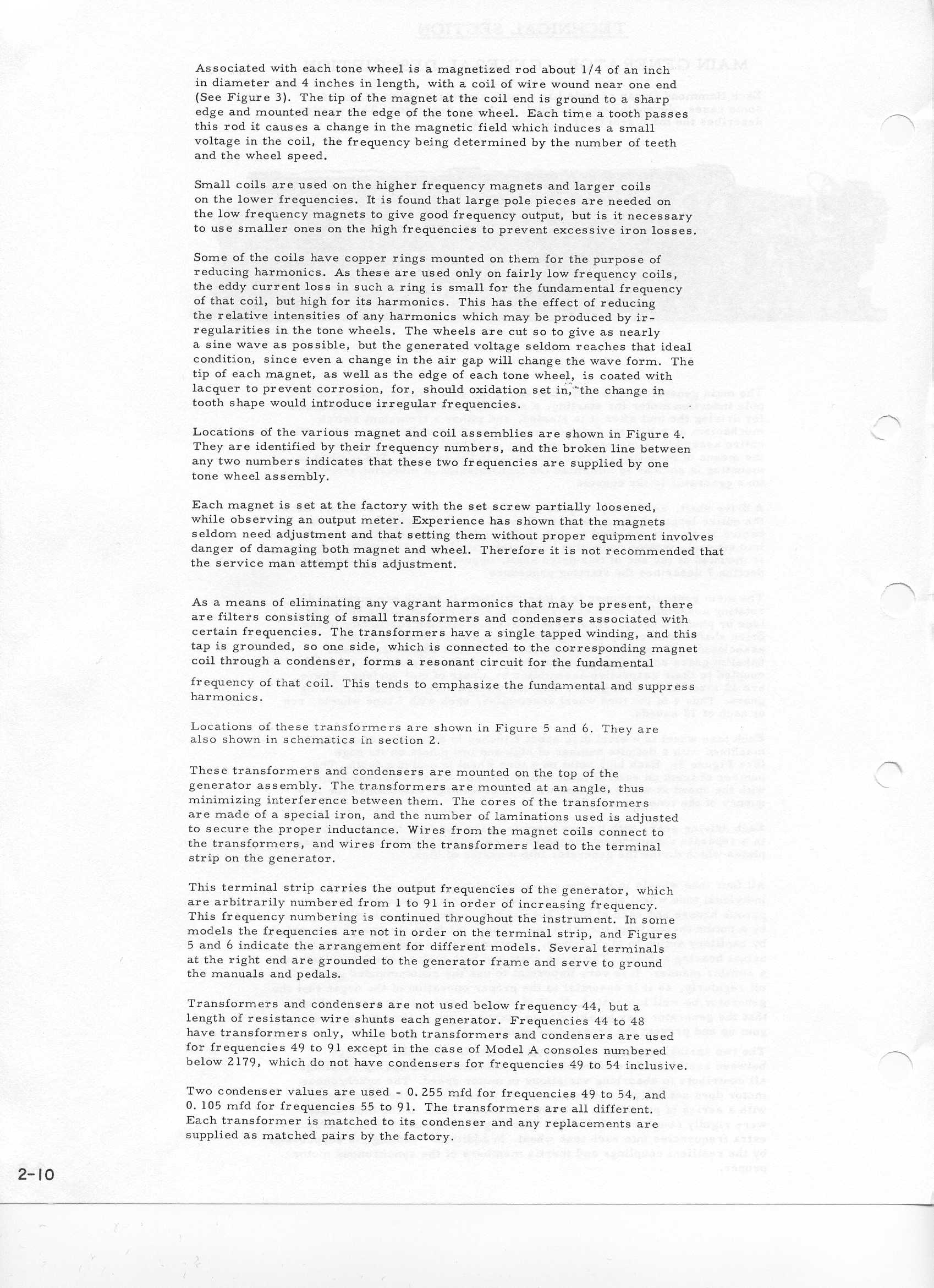Preset Keys 1-14 Pedal Toe Pistons (model E Console) 1-15 Models RT, RT-2, RT-3 & D-100 Echo Switch 1-16 Tremulant Precussion 1-17 Tone Generator Tone Cabinets 1-18 Power Amplifier Reverberation System 1-19 SECTION II - INSTALLATION, MAINTENANCE AND TECHNICAL INFORMATION (thumbnails 4) ACOUSTICS 2-1 INSTALLATION & MAINTENANCE CABLES 2-4 MAIN GENERATOR (FIGURE 1) (thumbnails 5) 91 Frequency