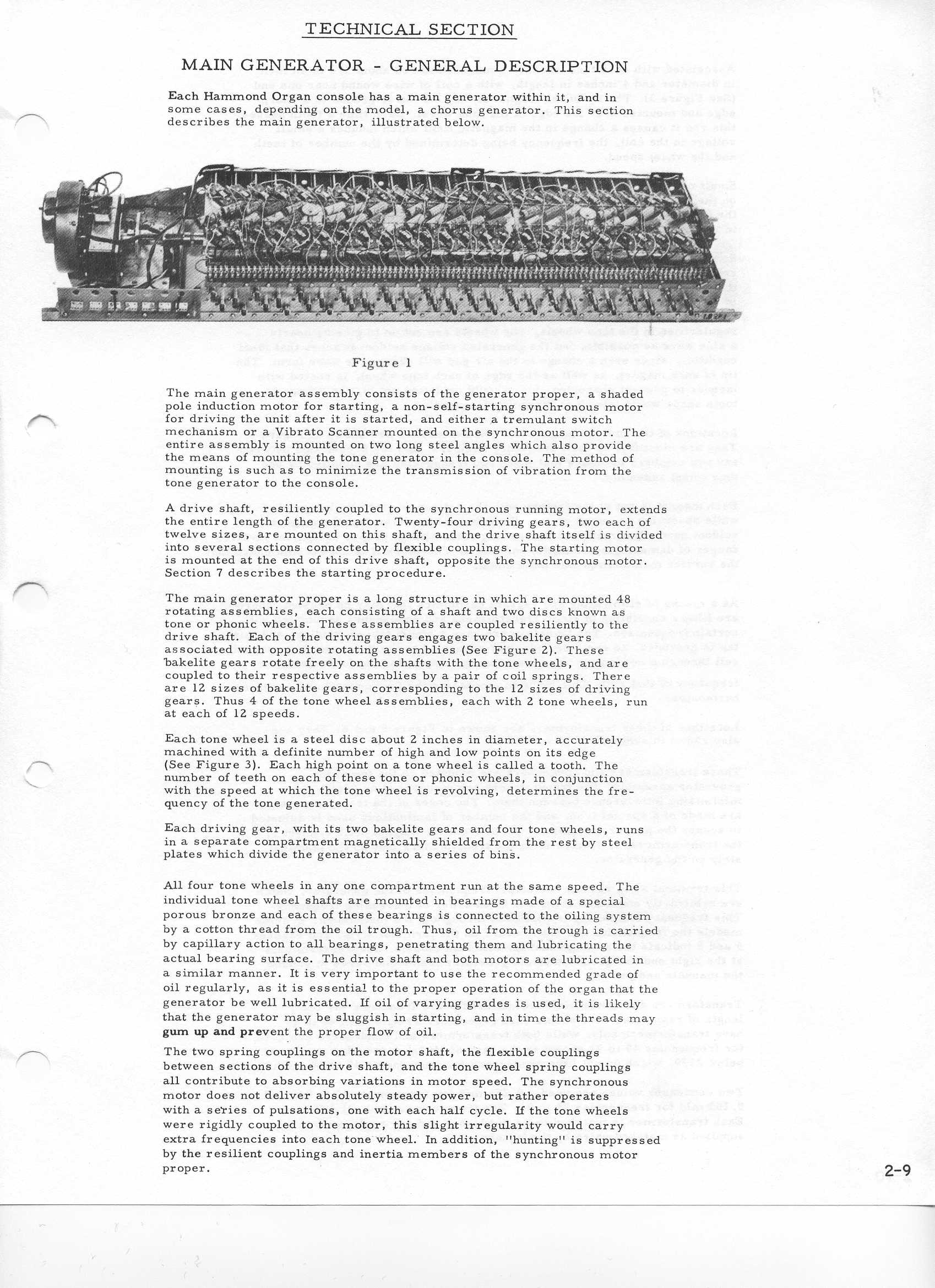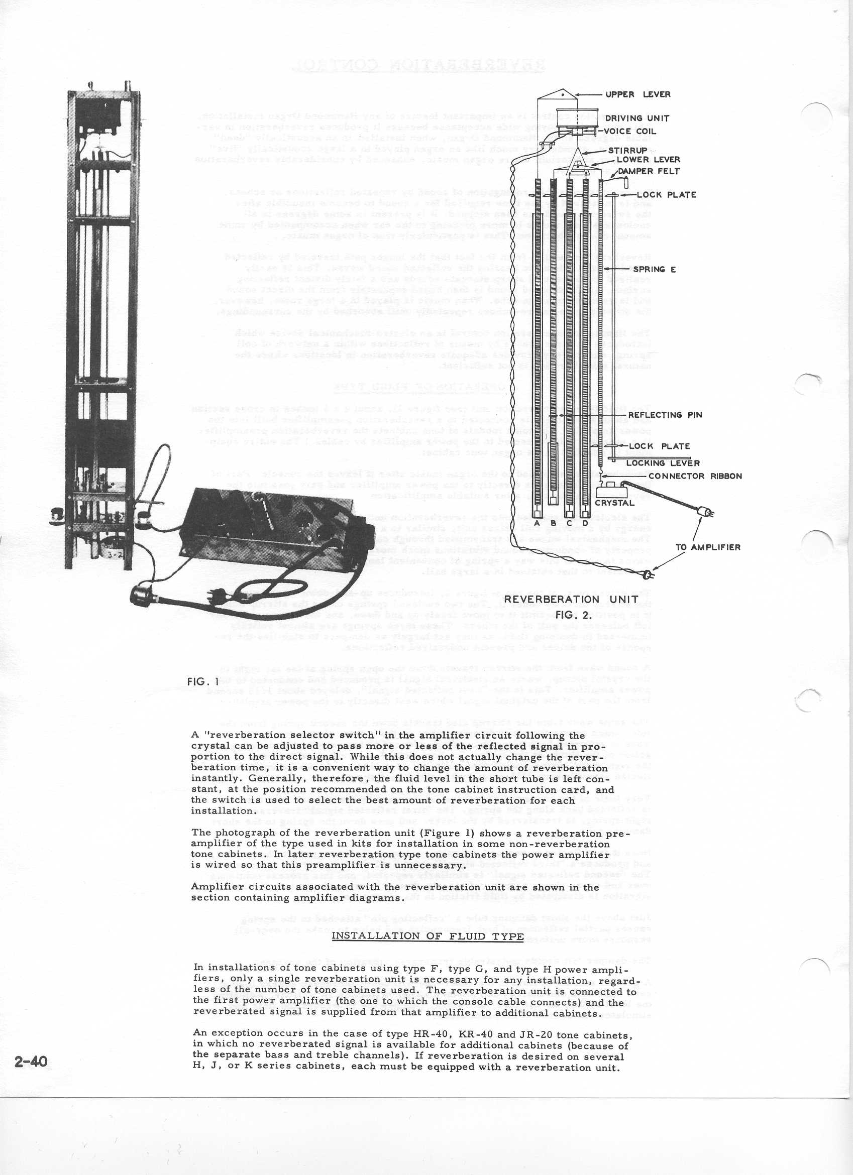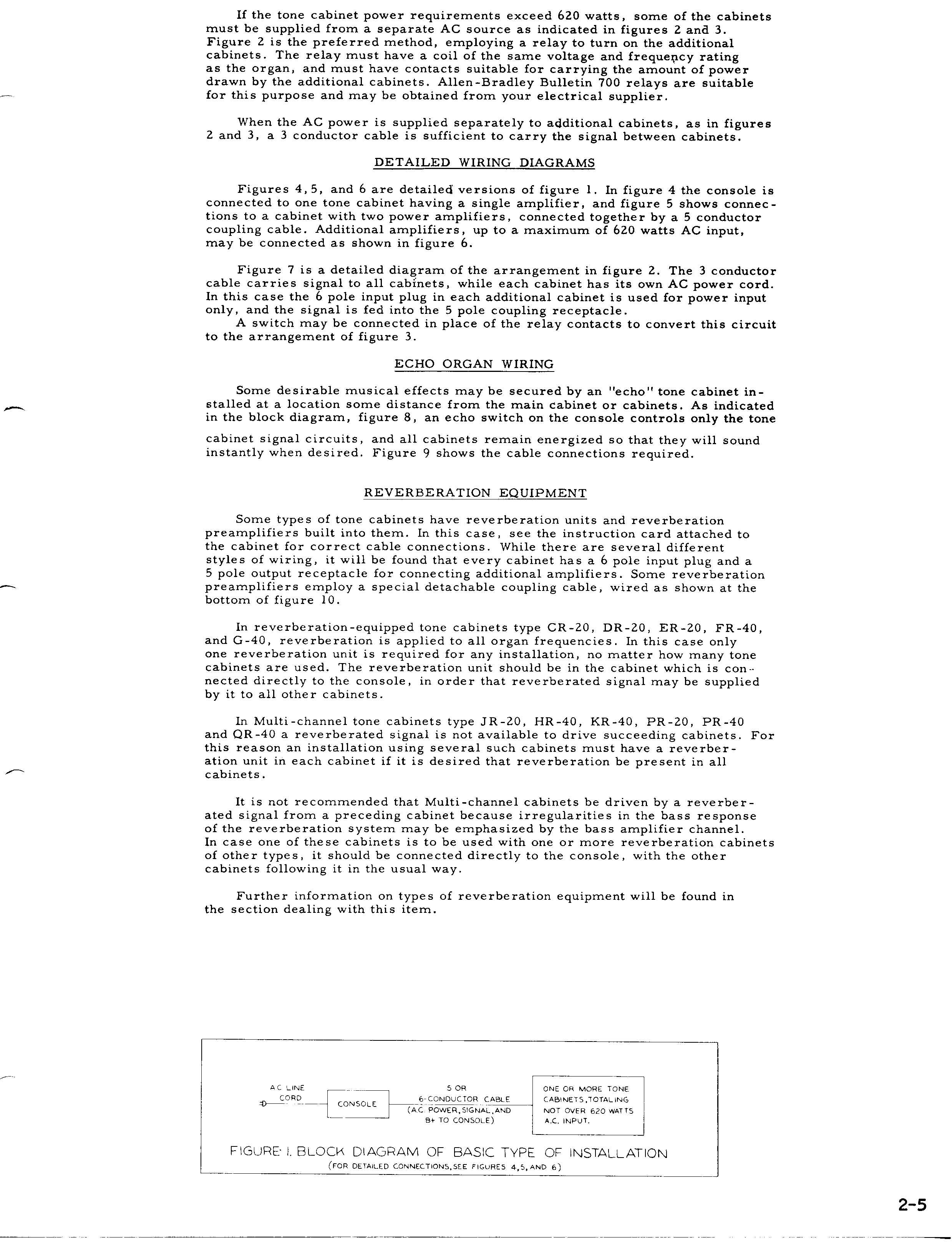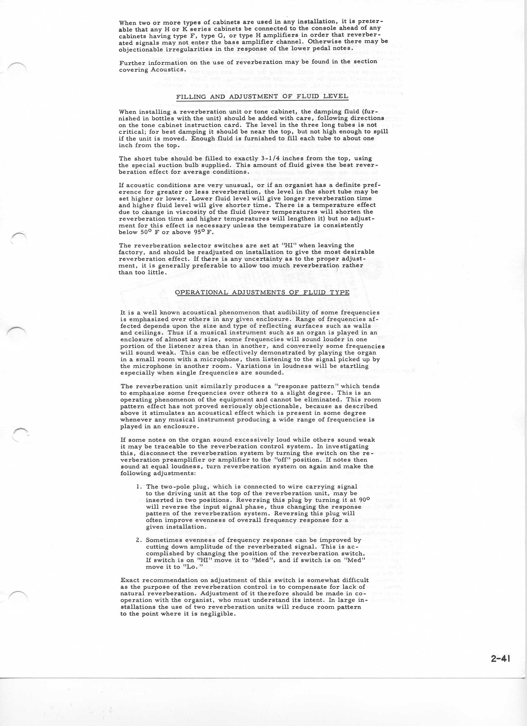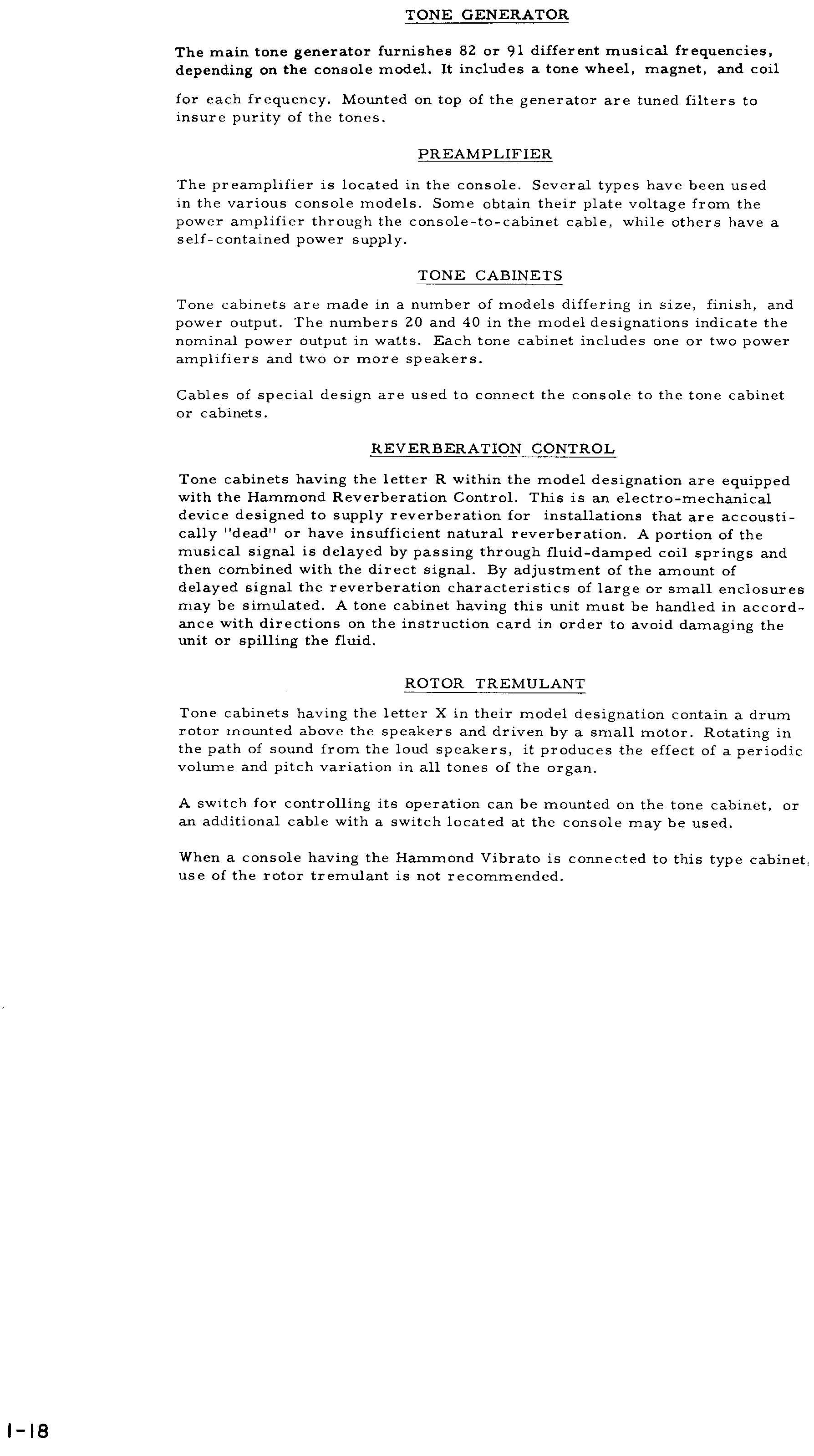 Preset Keys 1-14 Pedal Toe Pistons (model E Console) 1-15 Models RT, RT-2, RT-3 & D-100 Echo Switch 1-16 Tremulant Precussion 1-17 Tone Generator Tone Cabinets 1-18 Power Amplifier Reverberation System 1-19 SECTION II - INSTALLATION, MAINTENANCE AND TECHNICAL INFORMATION (thumbnails 4) ACOUSTICS 2-1 INSTALLATION & MAINTENANCE CABLES 2-4 MAIN GENERATOR (FIGURE 1) (thumbnails 5) 91 Frequency
