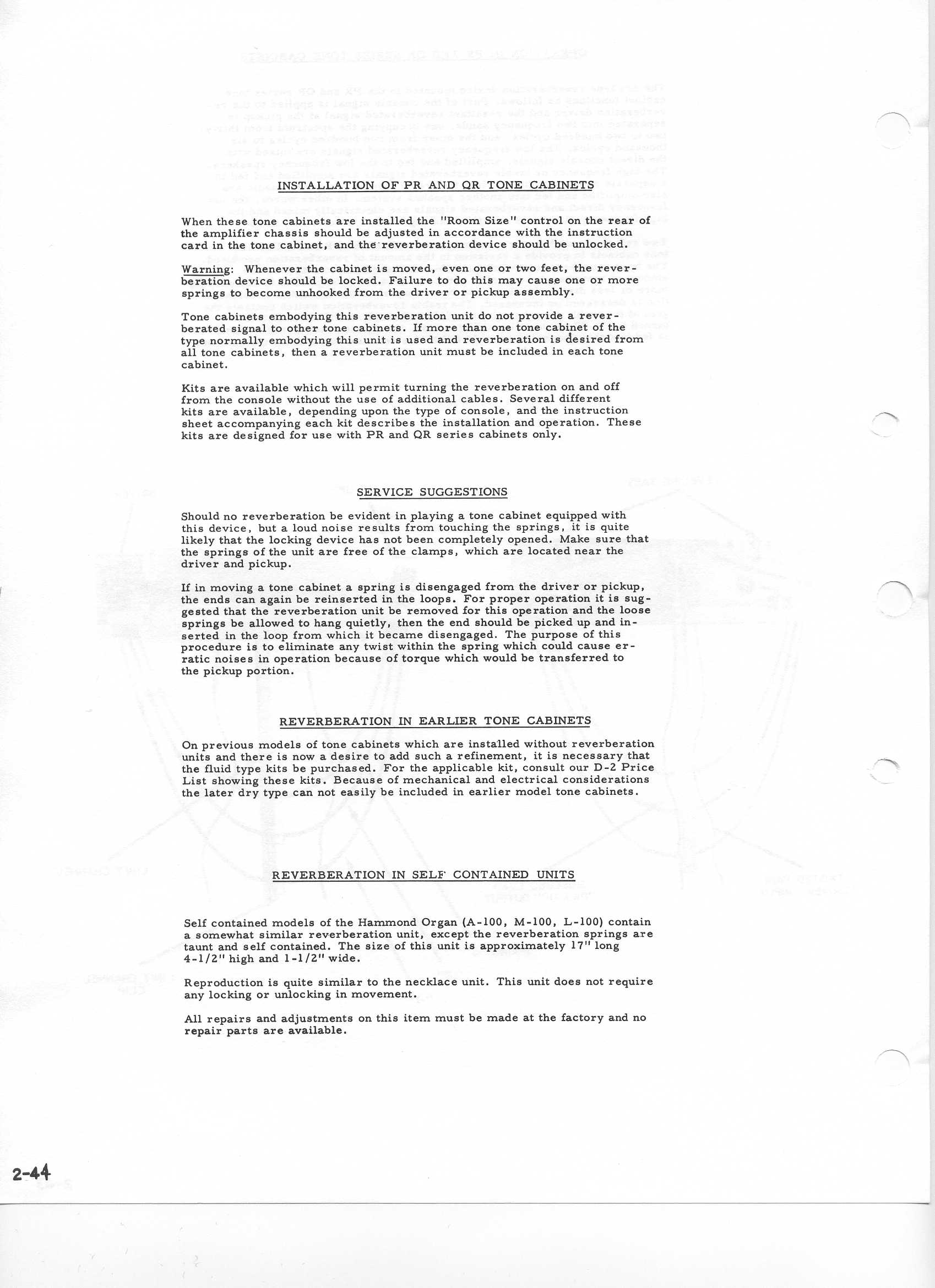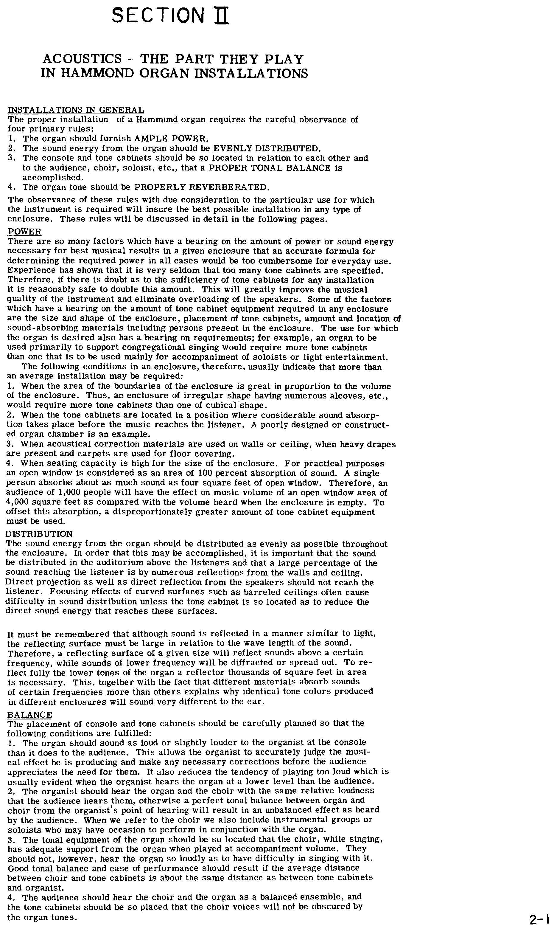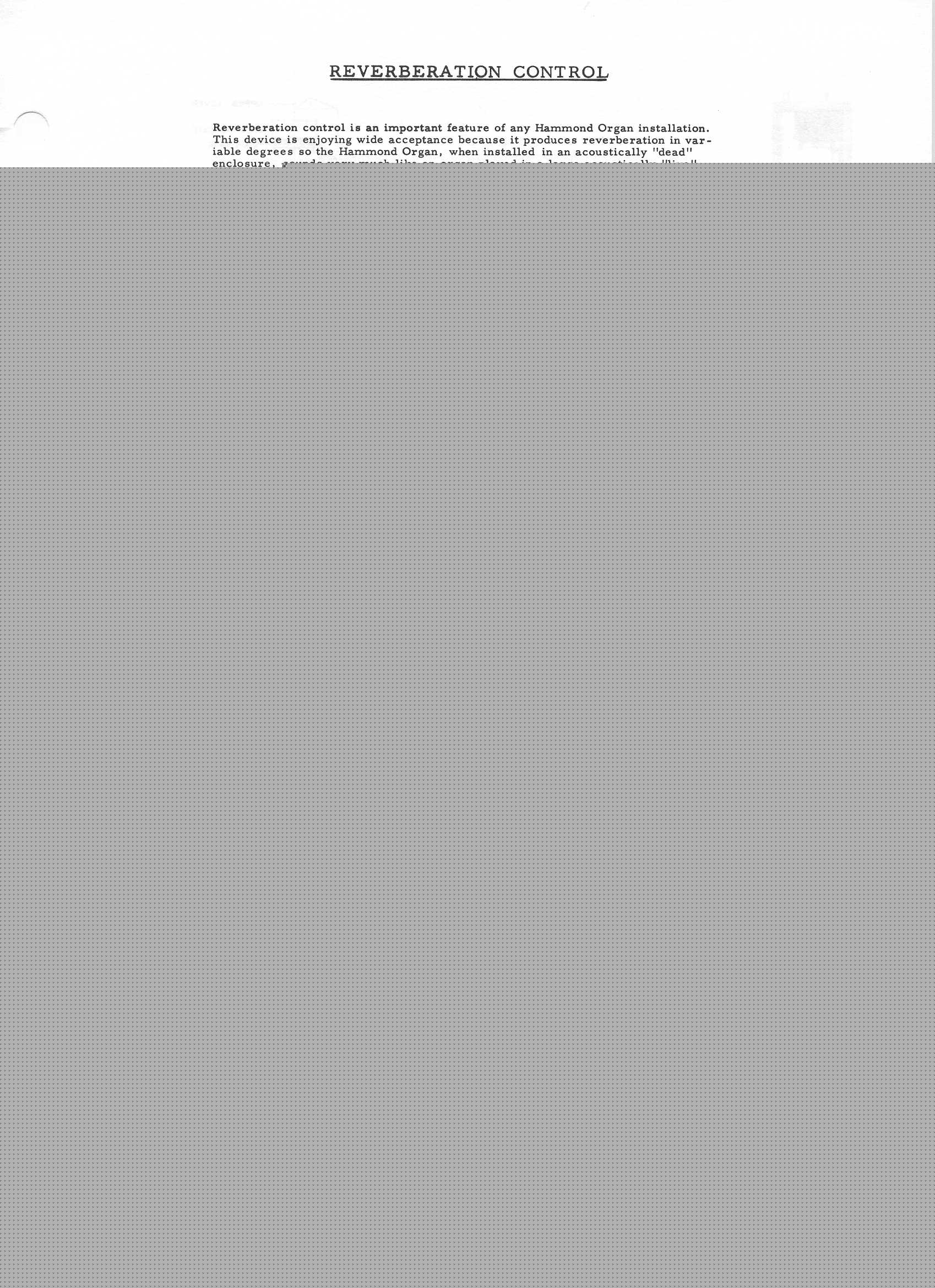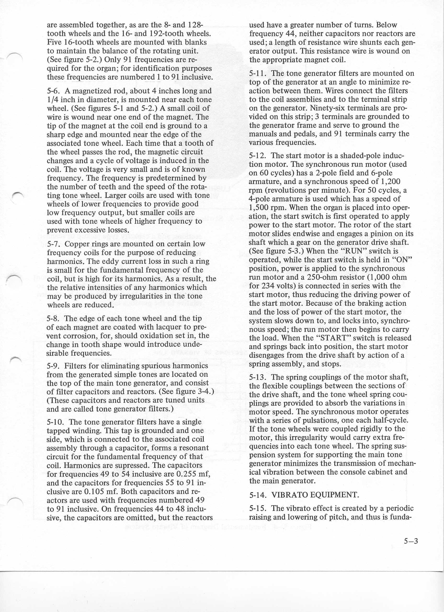 Preset Keys 1-14 Pedal Toe Pistons (model E Console) 1-15 Models RT, RT-2, RT-3 & D-100 Echo Switch 1-16 Tremulant Precussion 1-17 Tone Generator Tone Cabinets 1-18 Power Amplifier Reverberation System 1-19 SECTION II - INSTALLATION, MAINTENANCE AND TECHNICAL INFORMATION (thumbnails 4) ACOUSTICS 2-1 INSTALLATION & MAINTENANCE CABLES 2-4 MAIN GENERATOR (FIGURE 1) (thumbnails 5) 91 Frequency