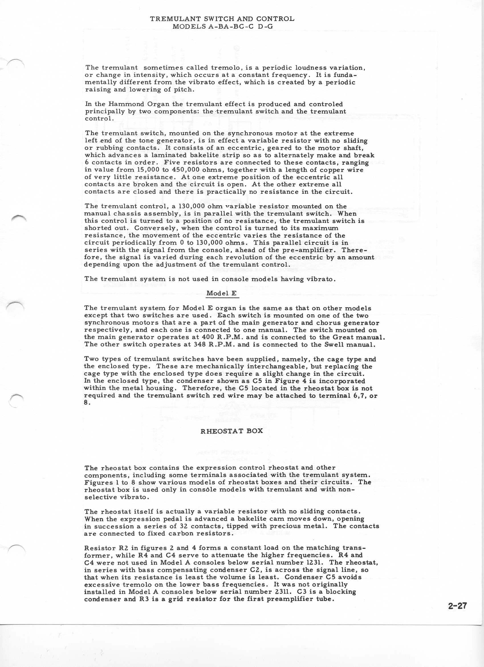 Model E 2-27 RHEOSTAT BOX 2-27 Rheostat Circuits (Figure 1 thru 8) 2-28, 2-29, 2-30, 2-31 VIBRATO Vibrato Diagram (Figure